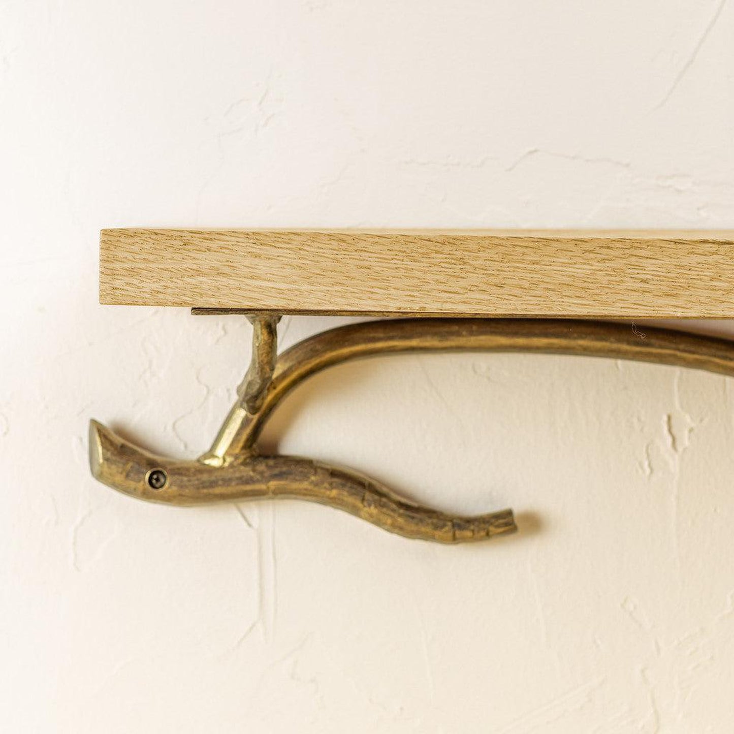 Twig Wall Shelf is a great entryway, kitchen, or bathroom shelf - equally at home in rustic and contemporary environments. Hand-forged by an artisan, each tree branch wall shelf is made with unique iron and reclaimed wood. Metal floating wall shelf shown in Burnished Gold Iron and Clear Oak.