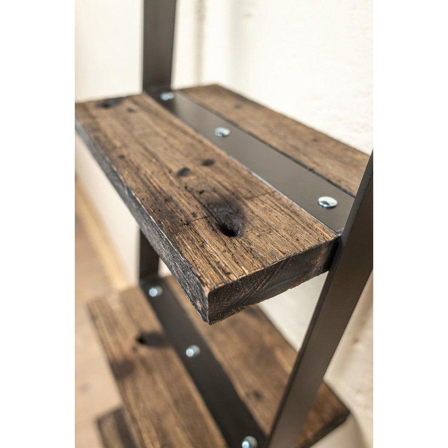 The Urban Forge wall ladder shelf is the perfect functional focal piece for both rustic and contemporary environments. The clean lines of the hand-forged frame beautifully contrast the character-filled, distressed boxcar wood shelves. The wood grain of this narrow ladder bookshelf is adorned with the scuffs and scratches to mimic old boards showing hard work over decades of time. The Urban Forge Ladder Wall Shelf is a modular piece that can be paired with the narrow shelf or the desks to create a stunning wall of storage and function. Wall attachment bracket kit included to secure the shelf to the wall. Rubber feet protect your floor.