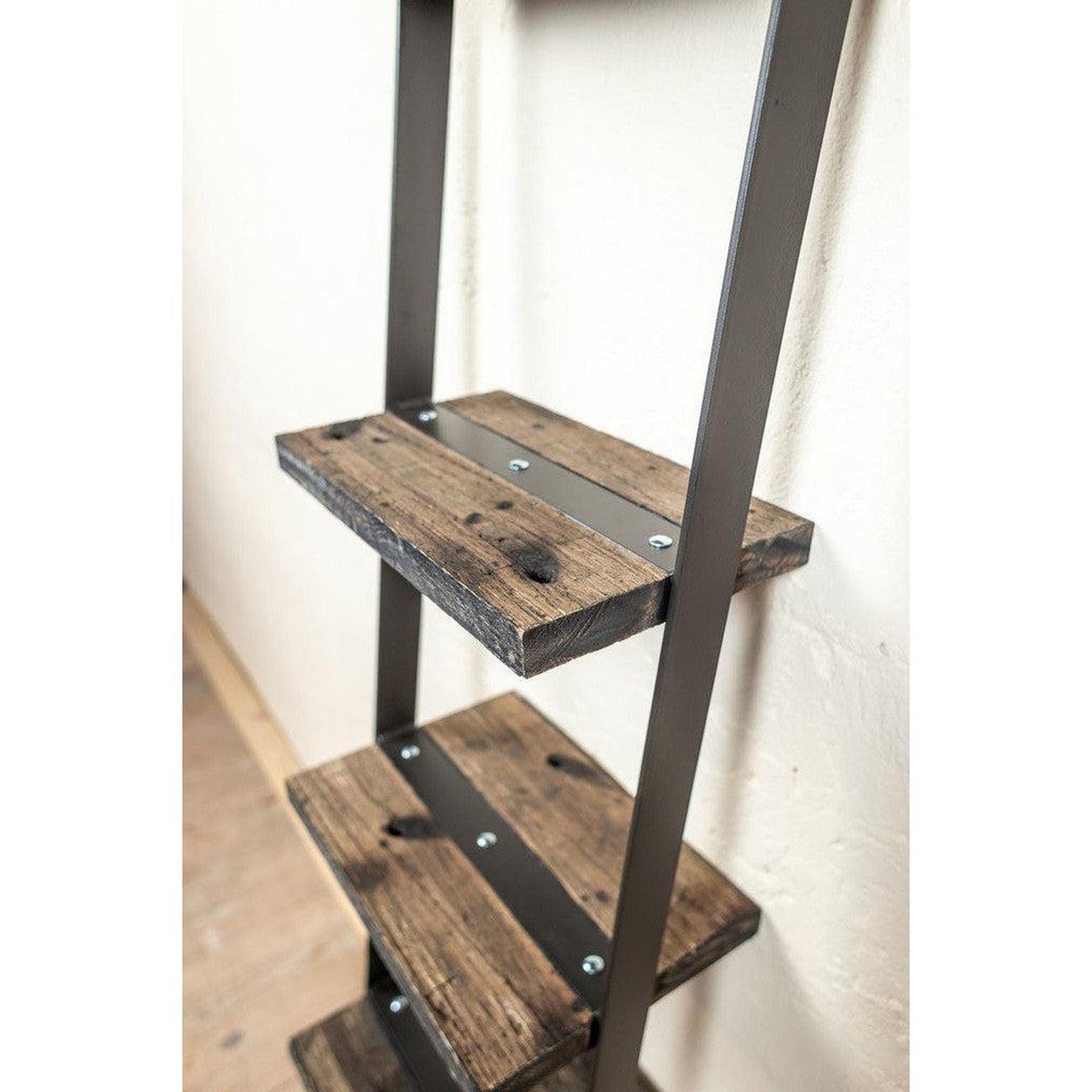 The Urban Forge wall ladder shelf is the perfect functional focal piece for both rustic and contemporary environments. The clean lines of the hand-forged frame beautifully contrast the character-filled, distressed boxcar wood shelves. The wood grain of this narrow ladder bookshelf is adorned with the scuffs and scratches to mimic old boards showing hard work over decades of time. The Urban Forge Ladder Wall Shelf is a modular piece that can be paired with the narrow shelf or the desks to create a stunning wall of storage and function. Wall attachment bracket kit included to secure the shelf to the wall. Rubber feet protect your floor.