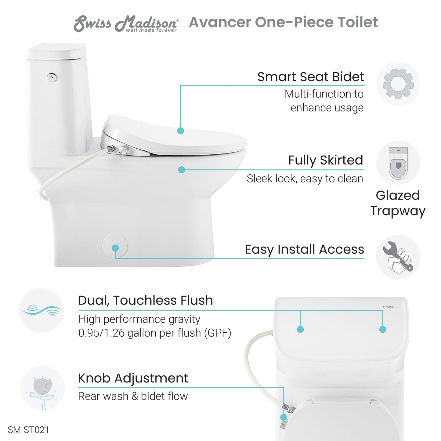 Swiss Madison Avancer 15" x 29" One-Piece White Elongated Floor-Mounted Toilet With 0.95/1.6 GPF Touchless Dual Flush and Cascade Smart Seat Bidet