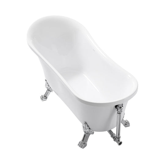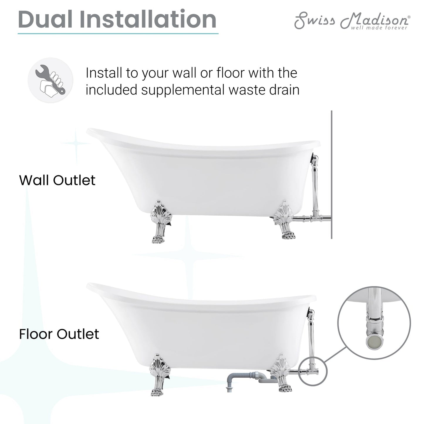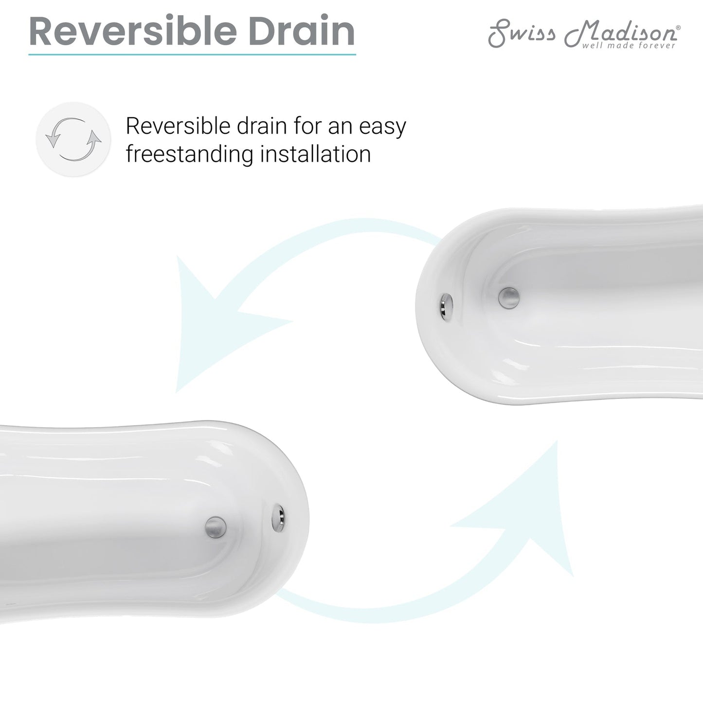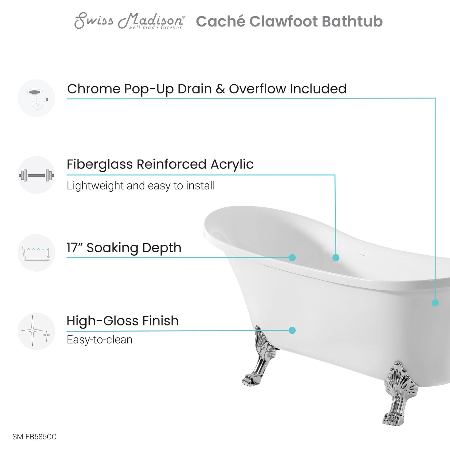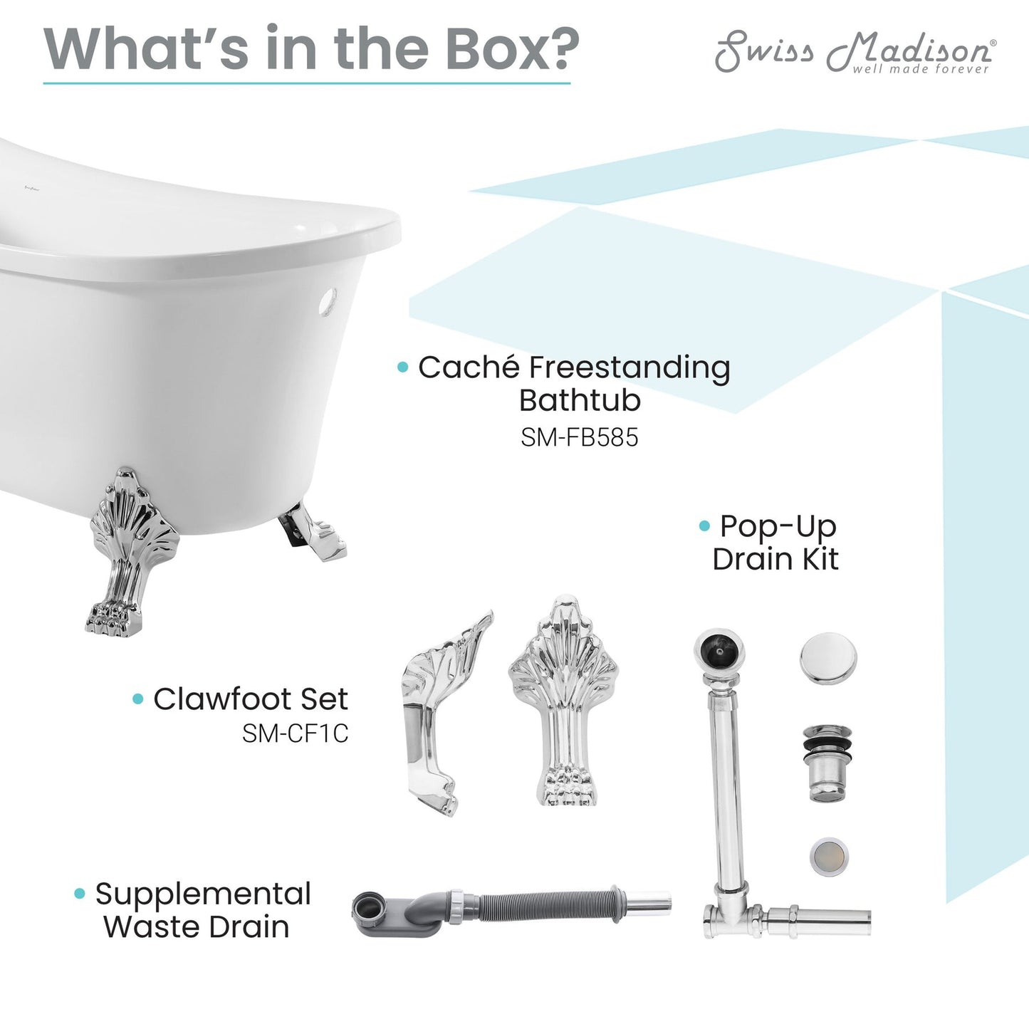 Swiss Madison Caché 63" x 29" White Right-Hand Drain Freestanding Bathtub With Adjustable Chrome Clawfoot Feet, Overflow Kit and Pop-Up Drain