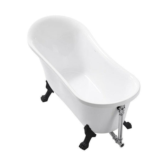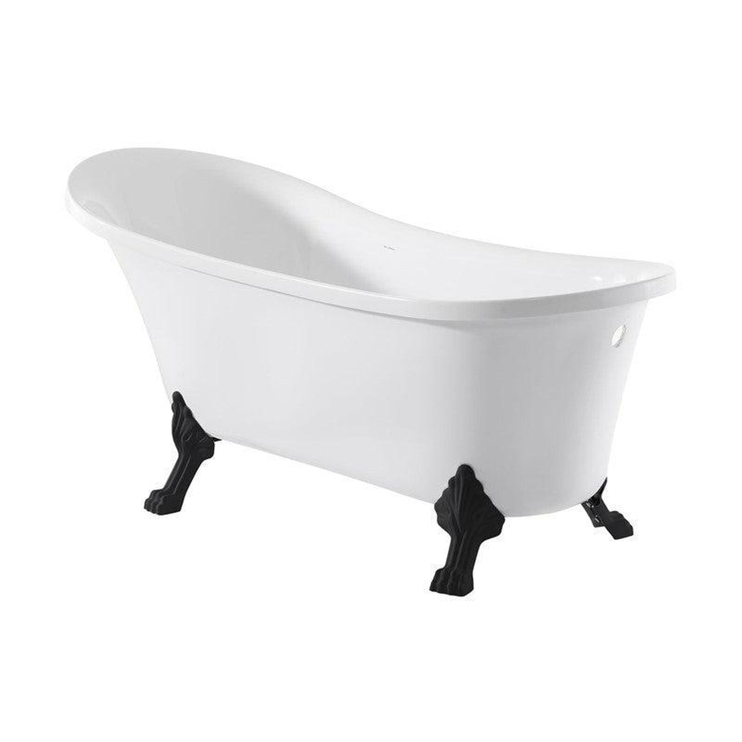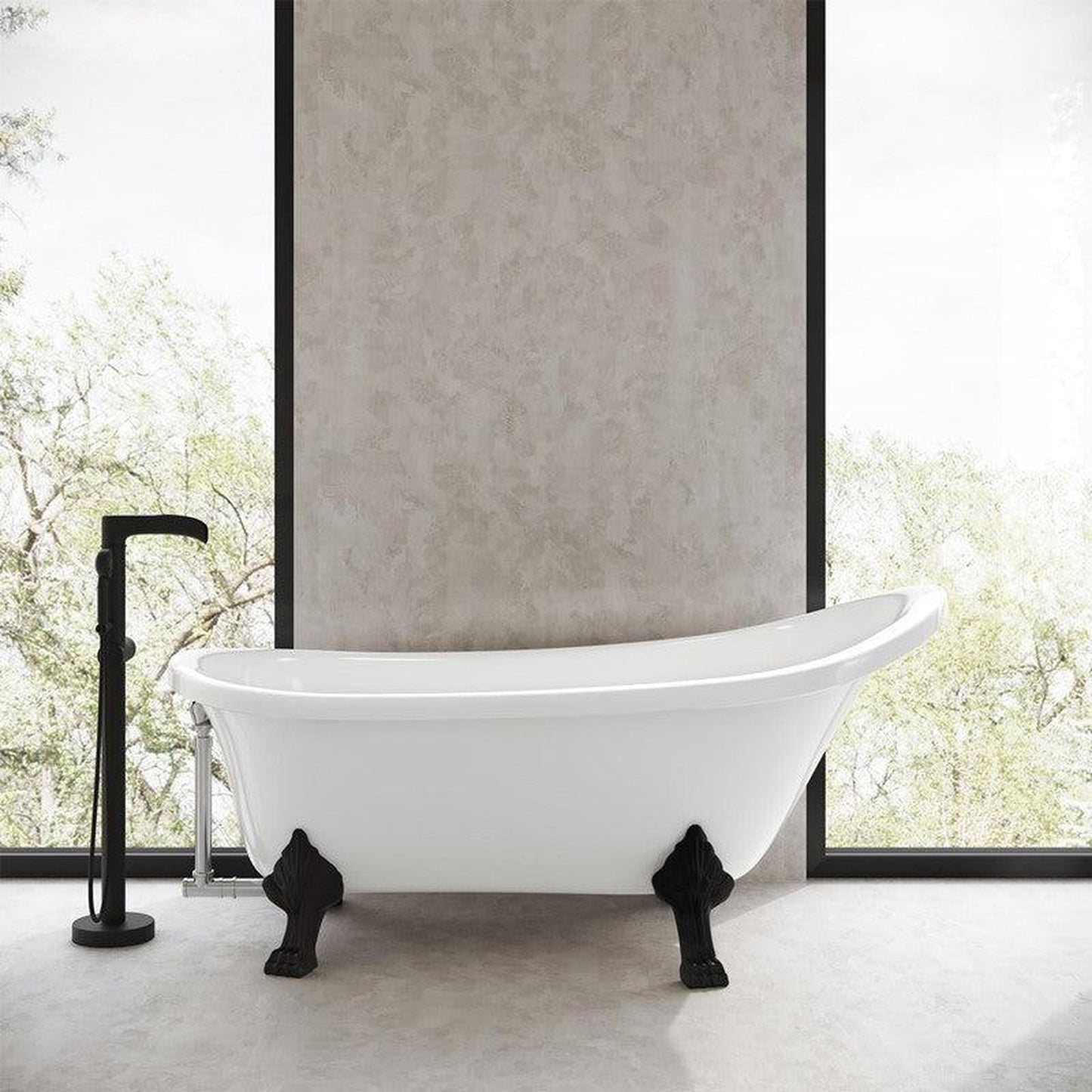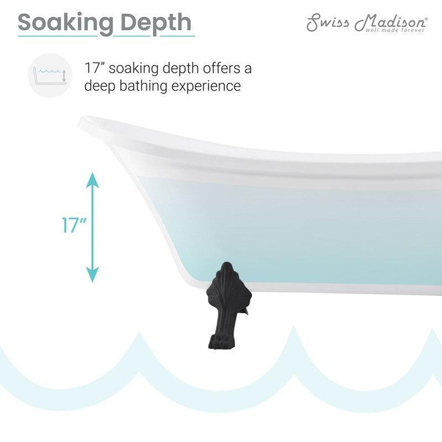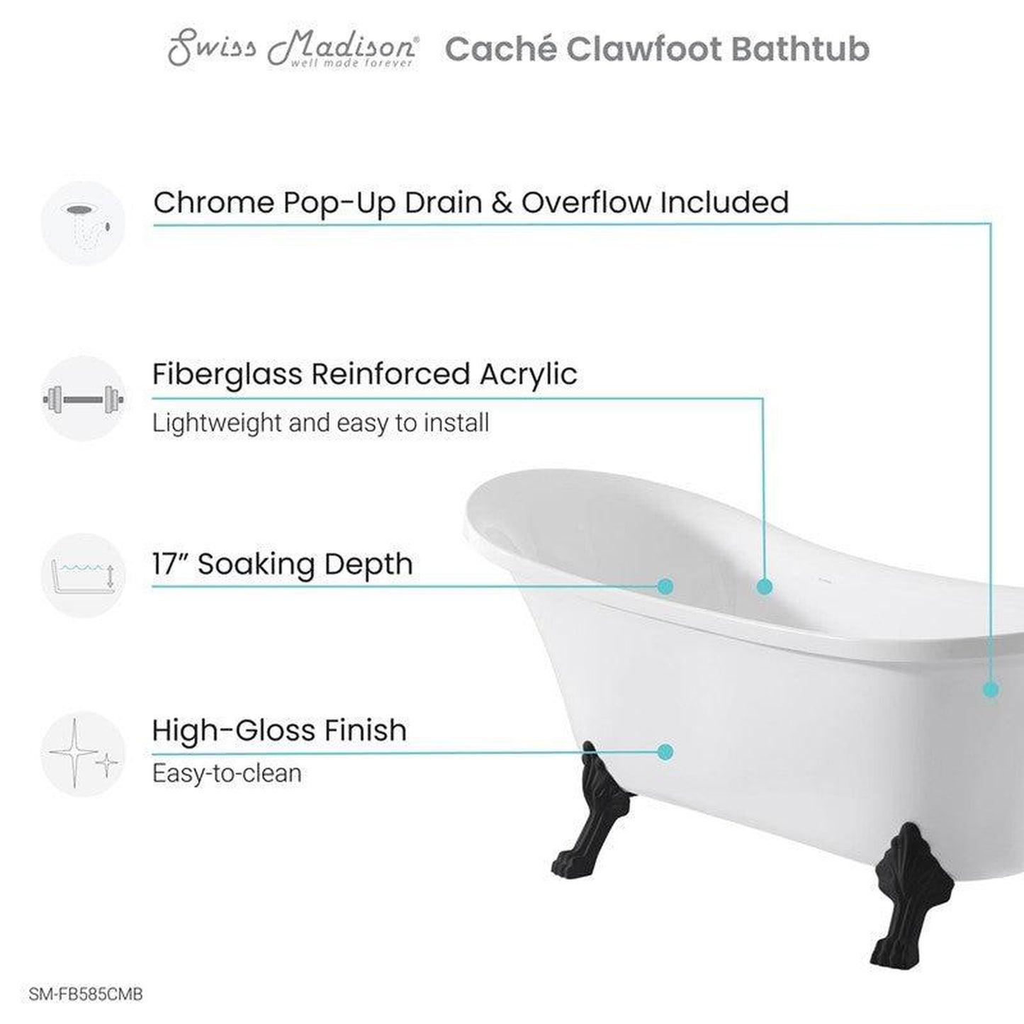 Swiss Madison Caché 63" x 29" White Right-Hand Drain Freestanding Bathtub With Adjustable Matte Black Clawfoot Feet, Overflow Kit and Pop-Up Drain