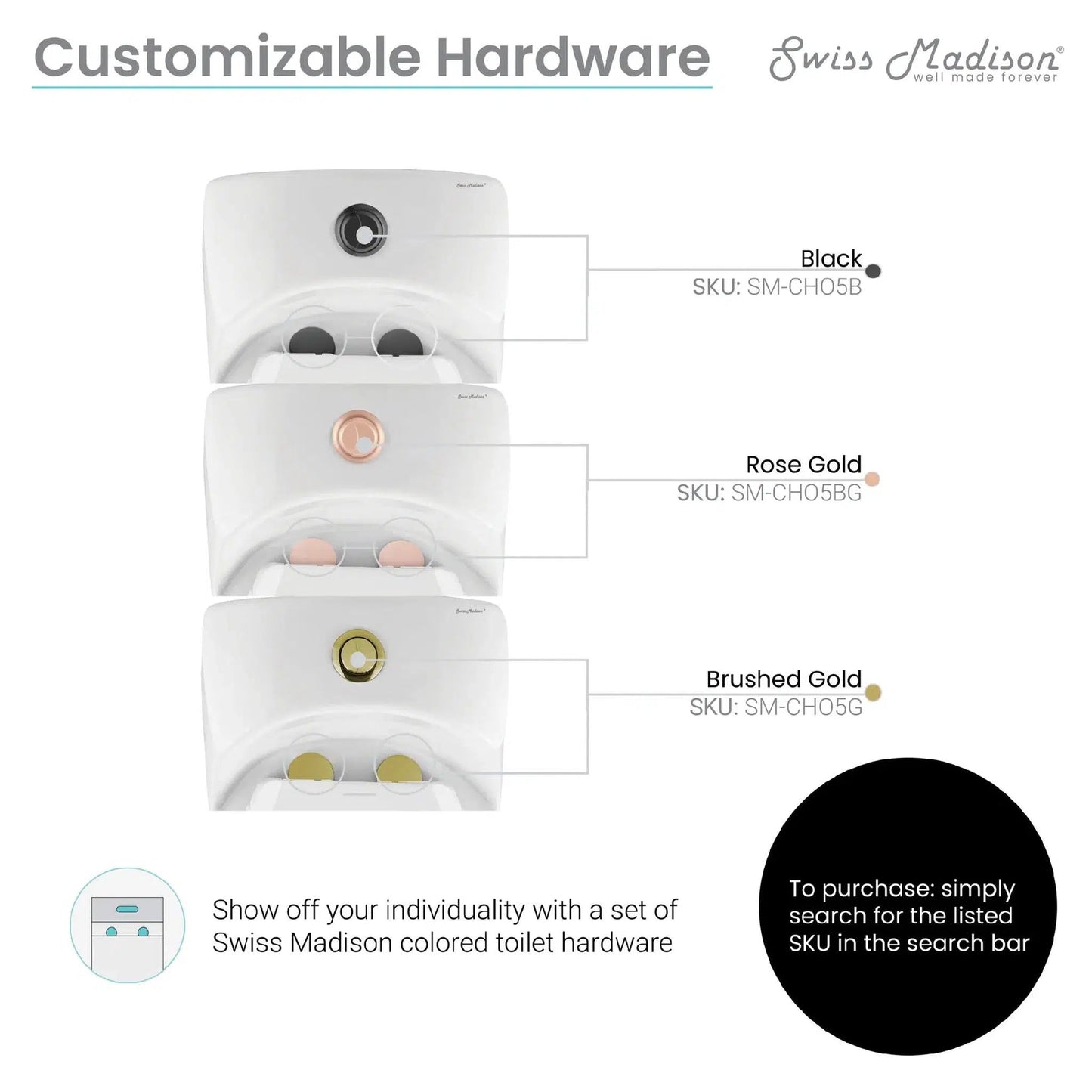 Swiss Madison products are made with quality materials and excellent craftsmanship to provide our customers with beautiful, durable, long-lasting products. Should there be any defects in materials or craftsmanship under regular use that are discovered within the first year of installation, Swiss Madison® will provide replacement parts at no charge, or at its discretion, replace any product or part of the product that is deemed defective, under normal installation, use, service or maintenance. This warranty applies only to the original purchaser. Proof of purchase will be required in the instance of a claim.