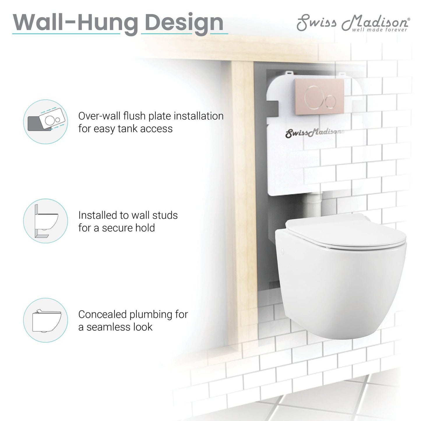 Discover intricate precision and design excellence in the Swiss Madison collection, redefining contemporary bathroom aesthetics. Optimize space and aesthetics with our wall-mount toilets, offering a clean and polished look with seamless integration. Offered in white with a glossy finish.