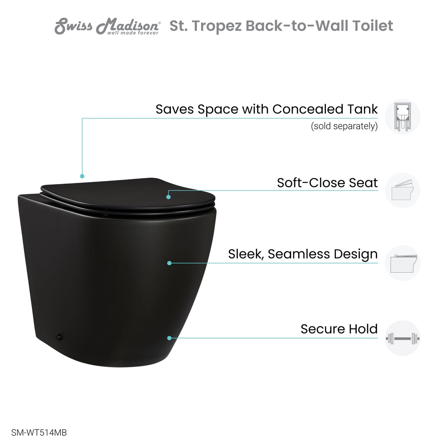 Swiss Madison St. Tropez 14" x 16" Matte Black Back-to-Wall Elongated Floor Mounted Toilet Bowl