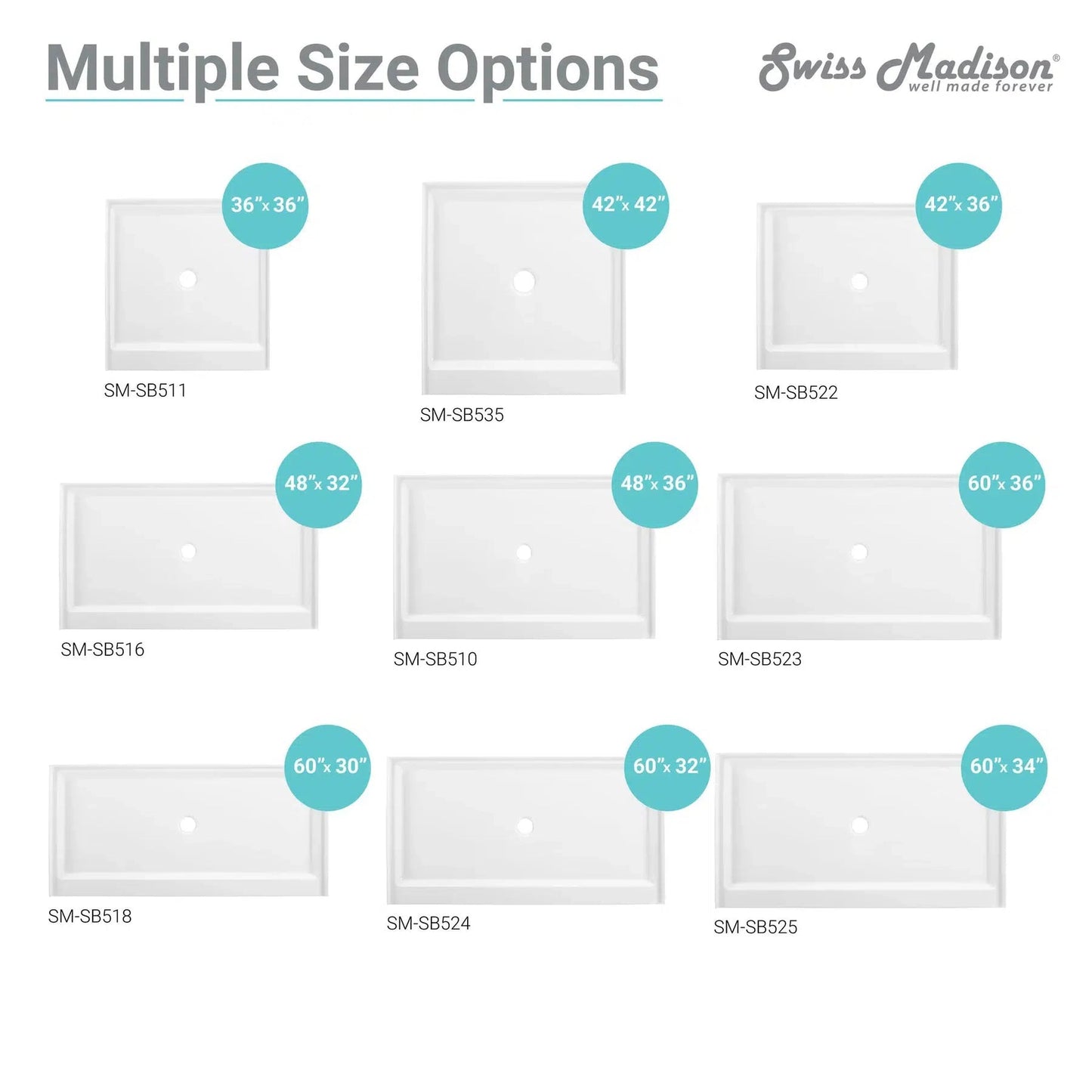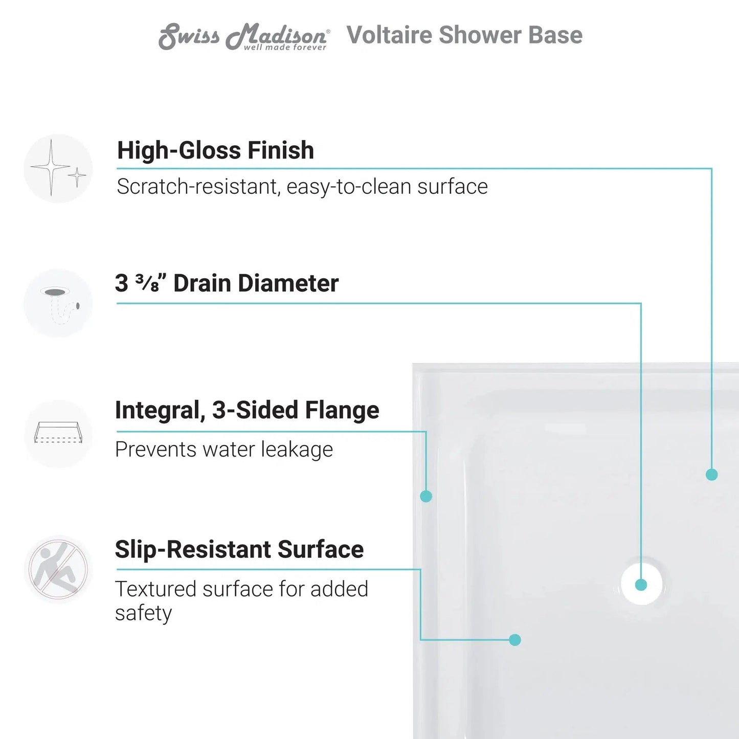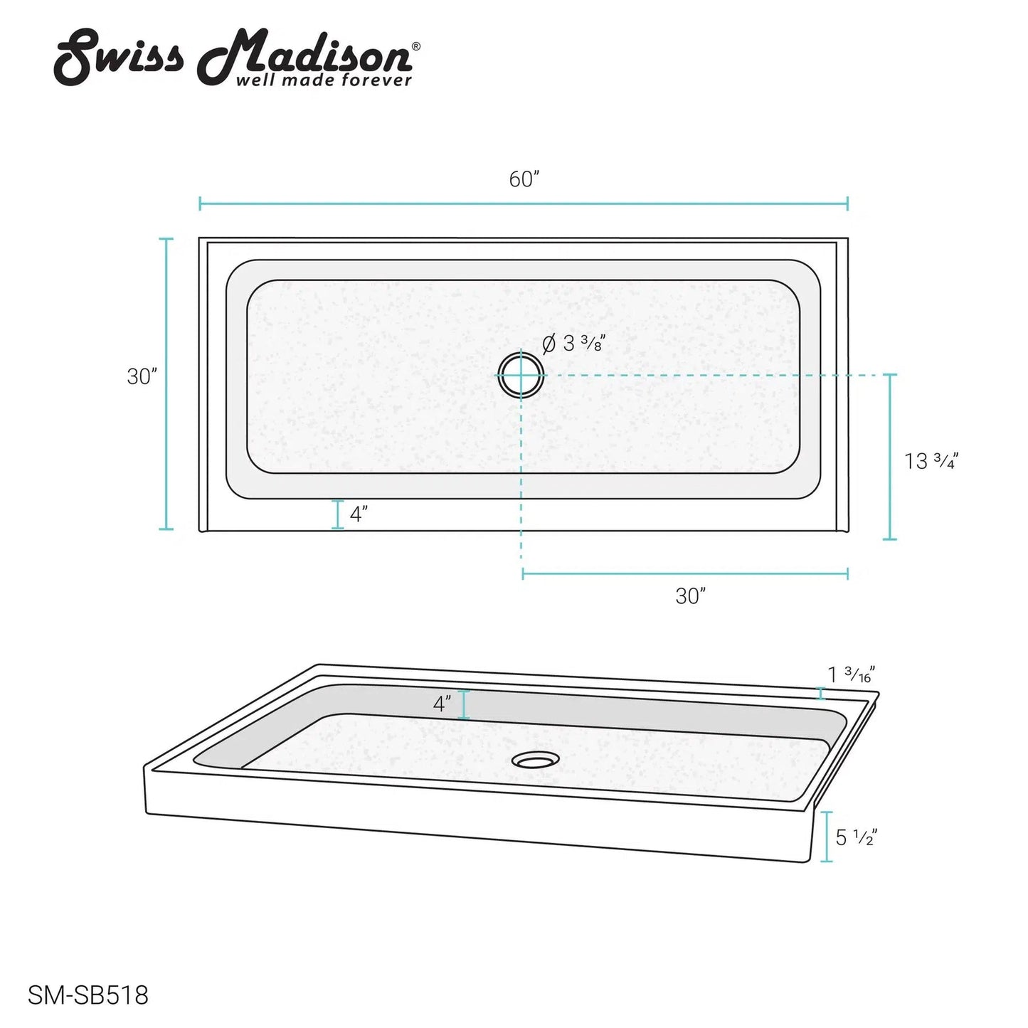 Swiss Madison Voltaire 60" x 30" Three-Wall Alcove White Center Drain Shower Base With Built-In Integral Flange