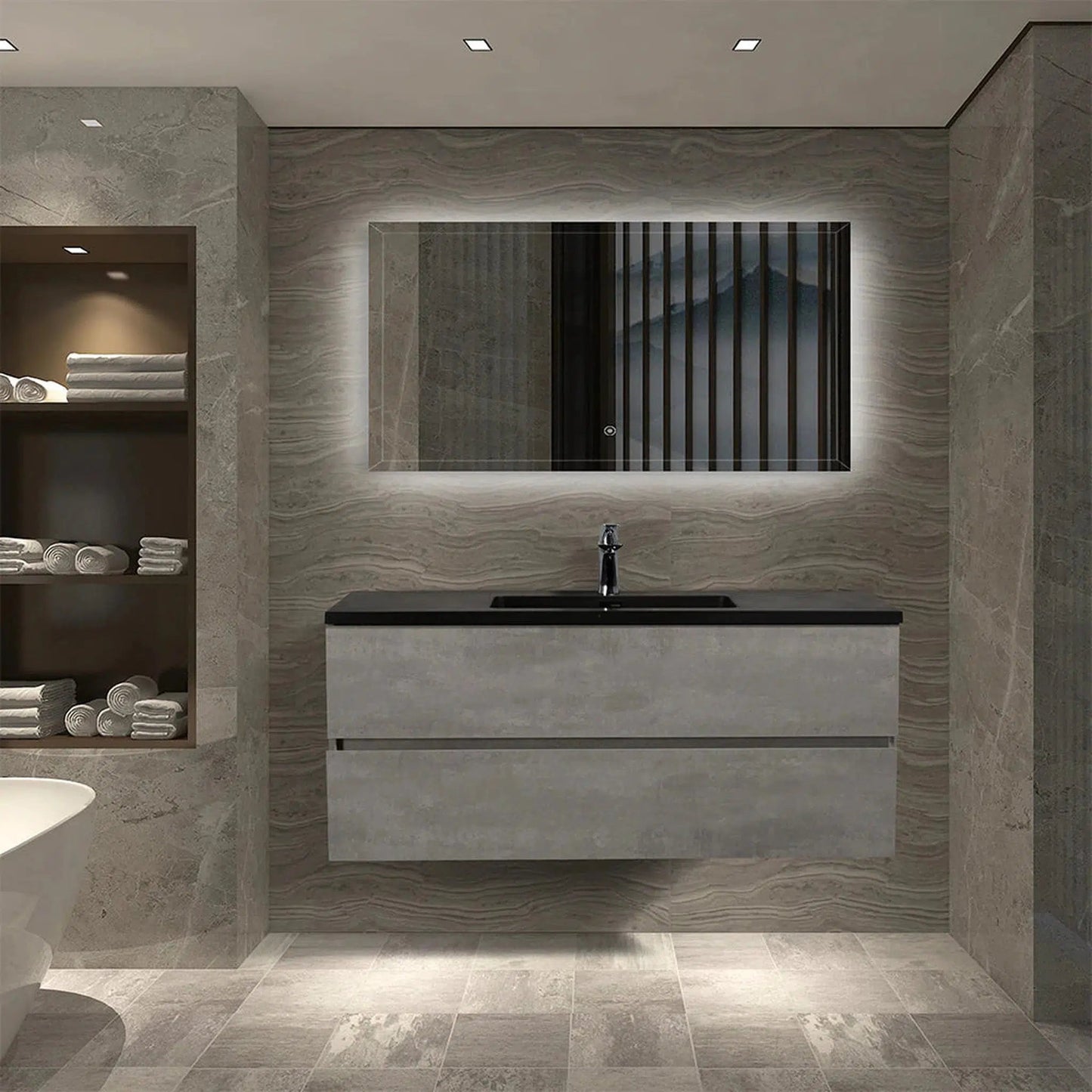 High-quality cement grey panel coordinates with black quartz sand basin. Strong industrial style.