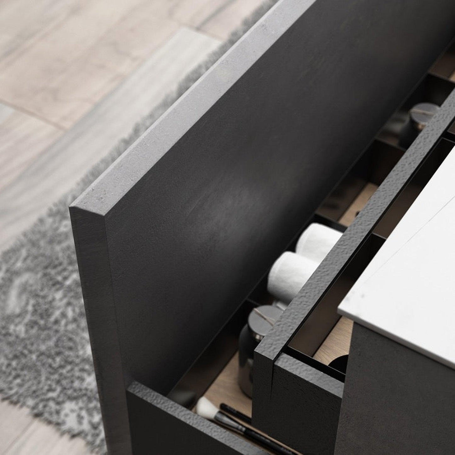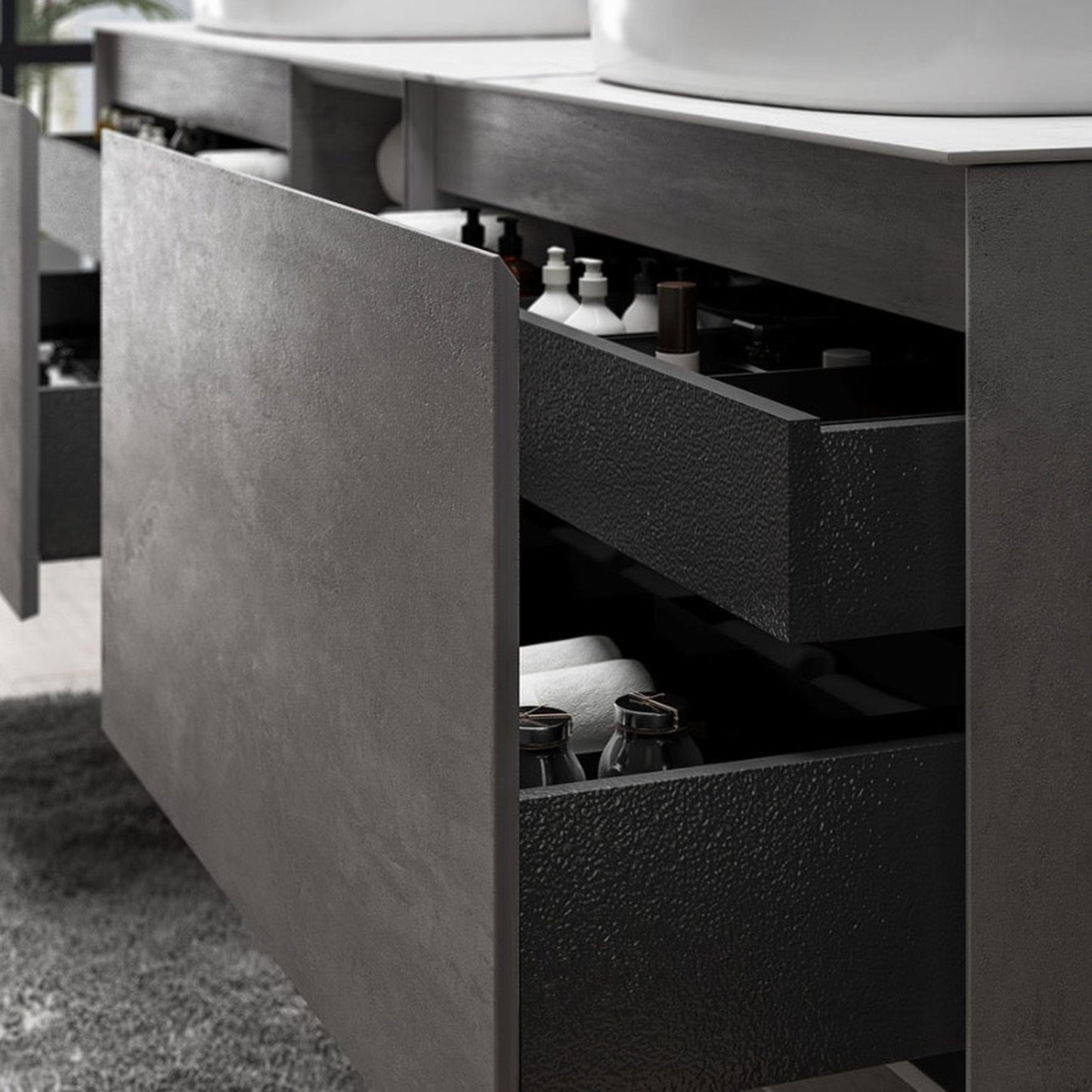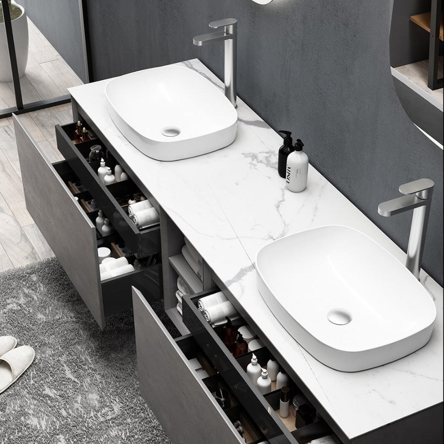 | Design | Italian porcelain slab countertop with marble grain. Unique multiple drawers design- big drawer with a concealed inner drawer, providing extra storage space. |