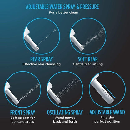 - Gentle Aerated, Warm Water, Dual Action Spray with oscillating and pulsating feature