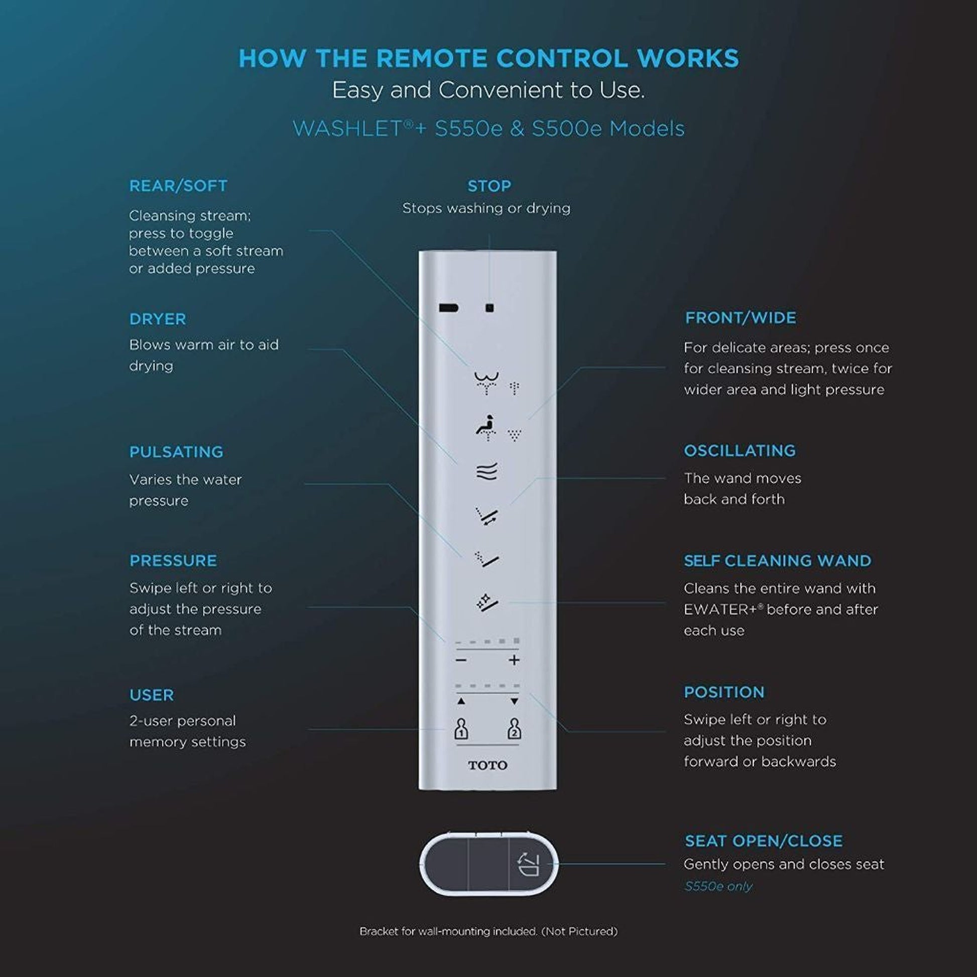 - Convenient slim wireless remote, with illuminated touch pad.