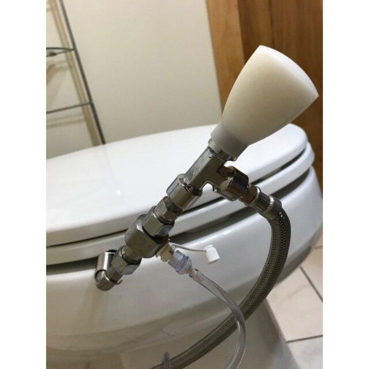 - Attach the included t-Valve to the water source and connect the waterlines from the tank and the bidet. Make sure that the connections are firm. Do not over-tighten.