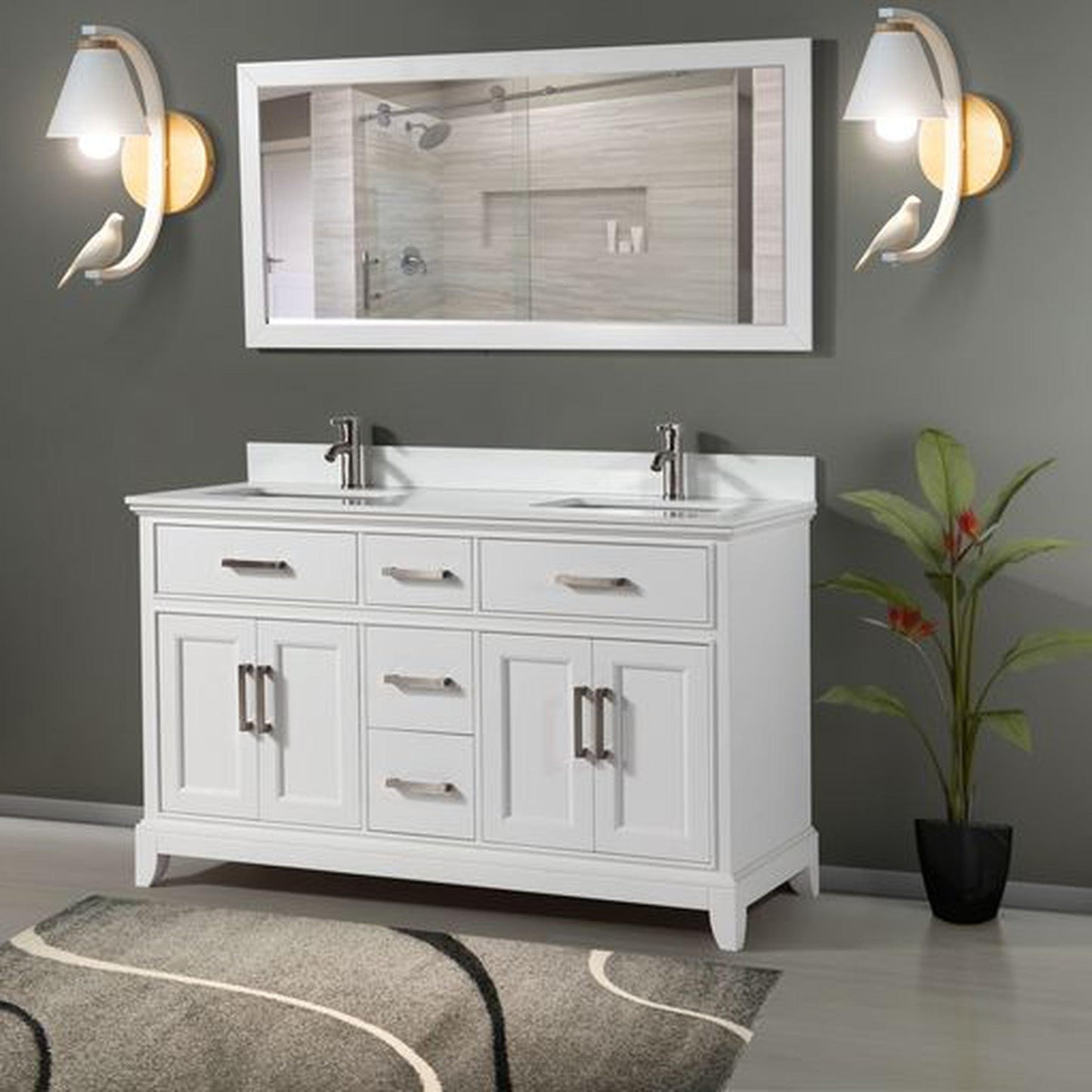 Add contemporary elegance to your bathroom with this 60-inch double vanity sink cabinet. Using the material Oak, Plywood, the beautifully constructed cabinet features four soft-closing doors, two shelves, and five drawers with finger jointed panels and dovetailed construction. The countertop is available in your choice of engineered marble, each of which coordinates beautifully with a solid neutral finish. The lovely vanity includes sinks and is available with matching the mirror. The 1-year limited warranty.