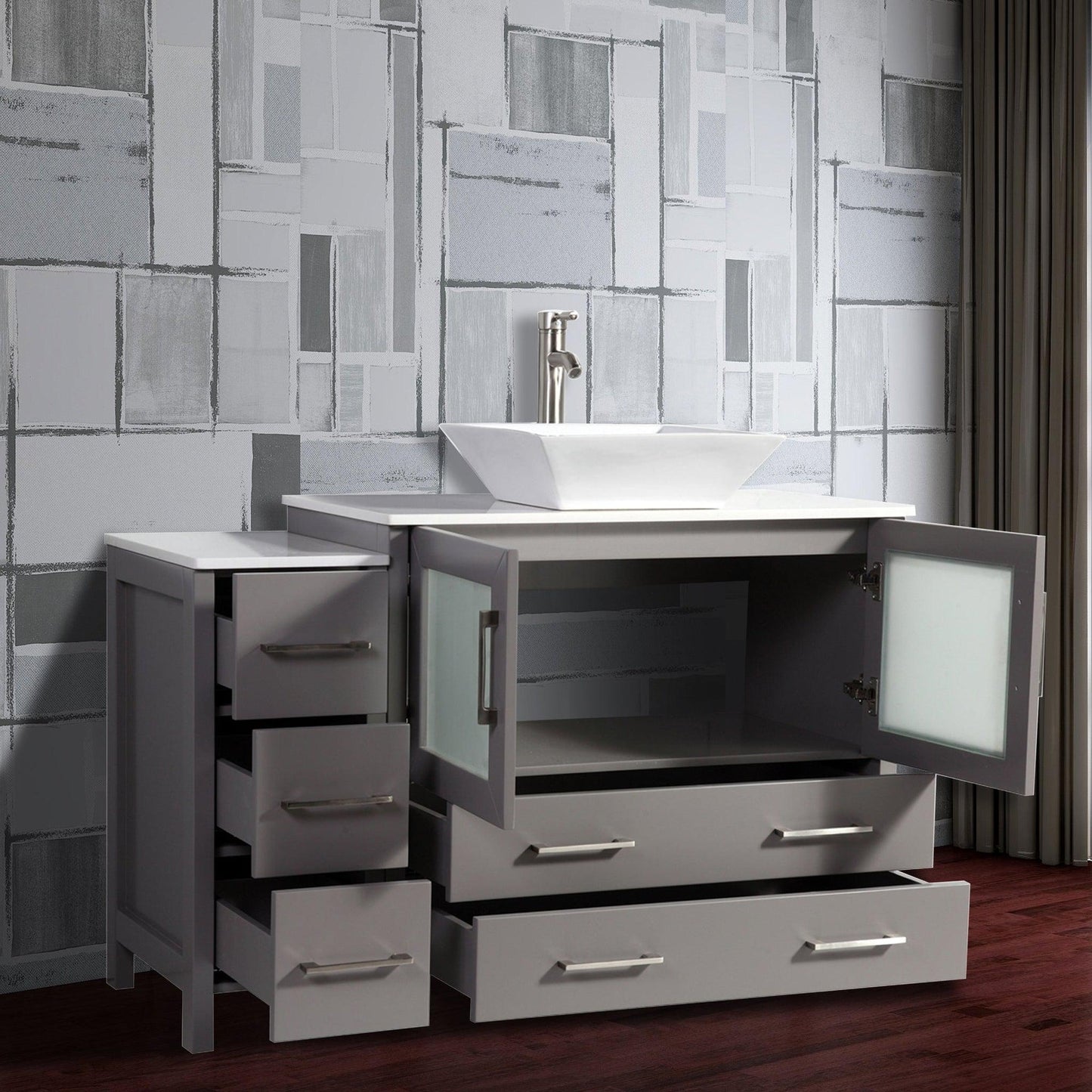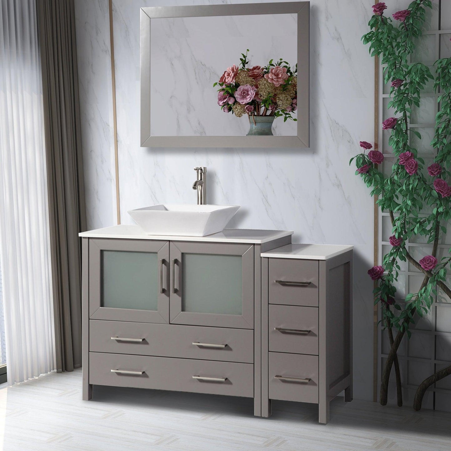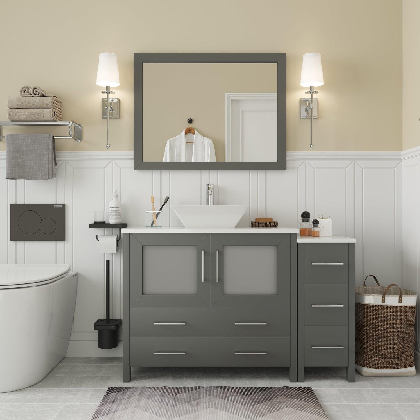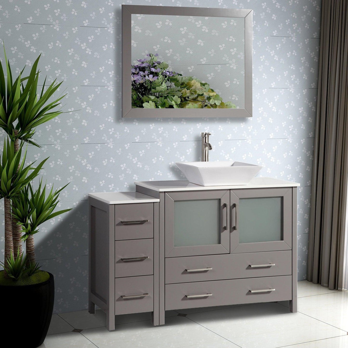 Vanity Art Ravenna 48" Single Gray Freestanding Vanity Set With White Engineered Marble Top, Ceramic Vessel Sink, 1 Side Cabinet and Mirror