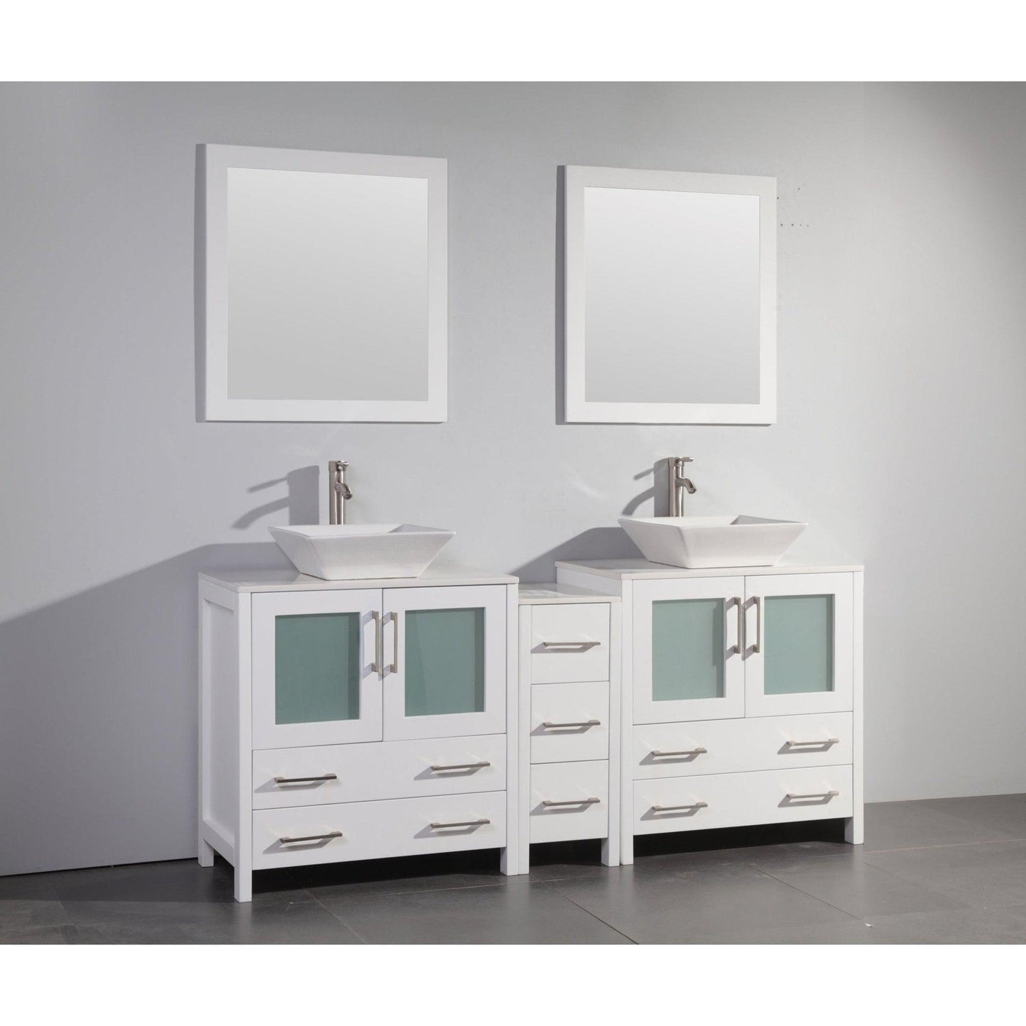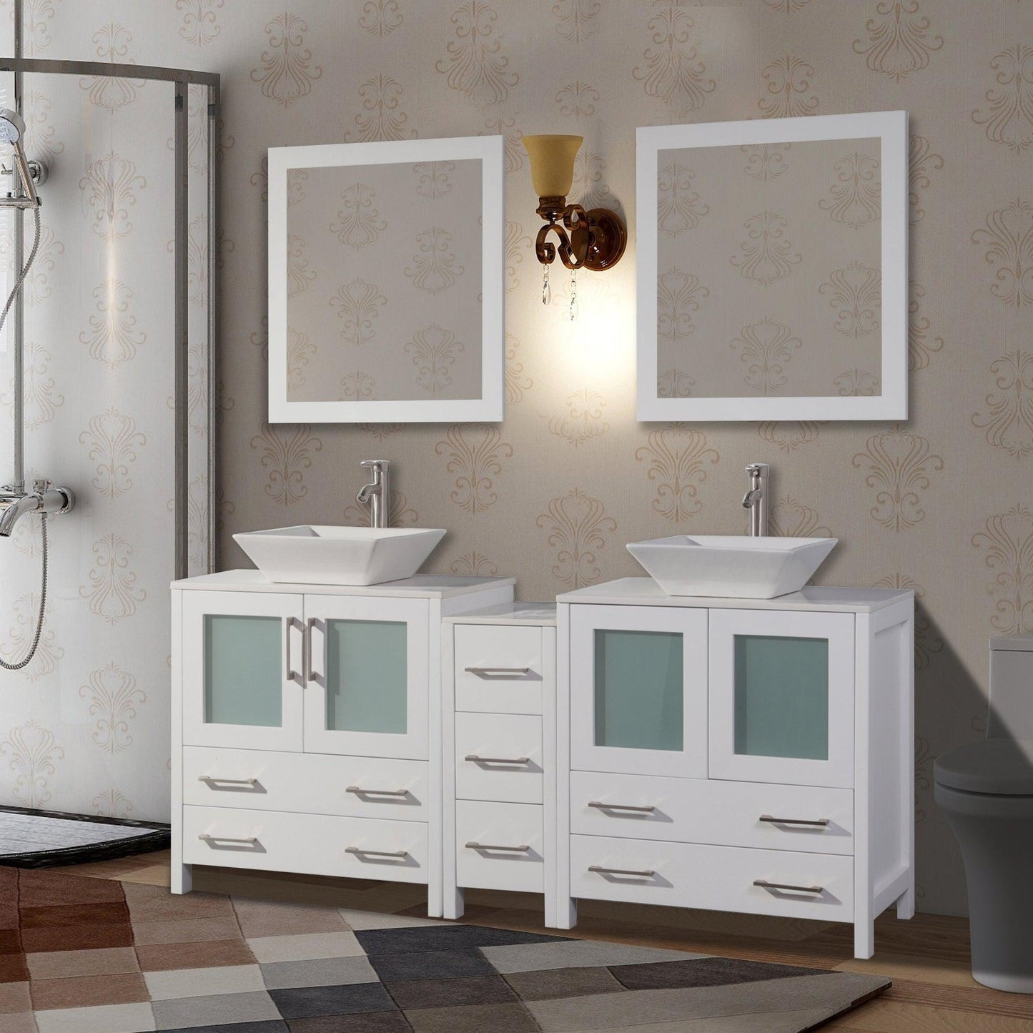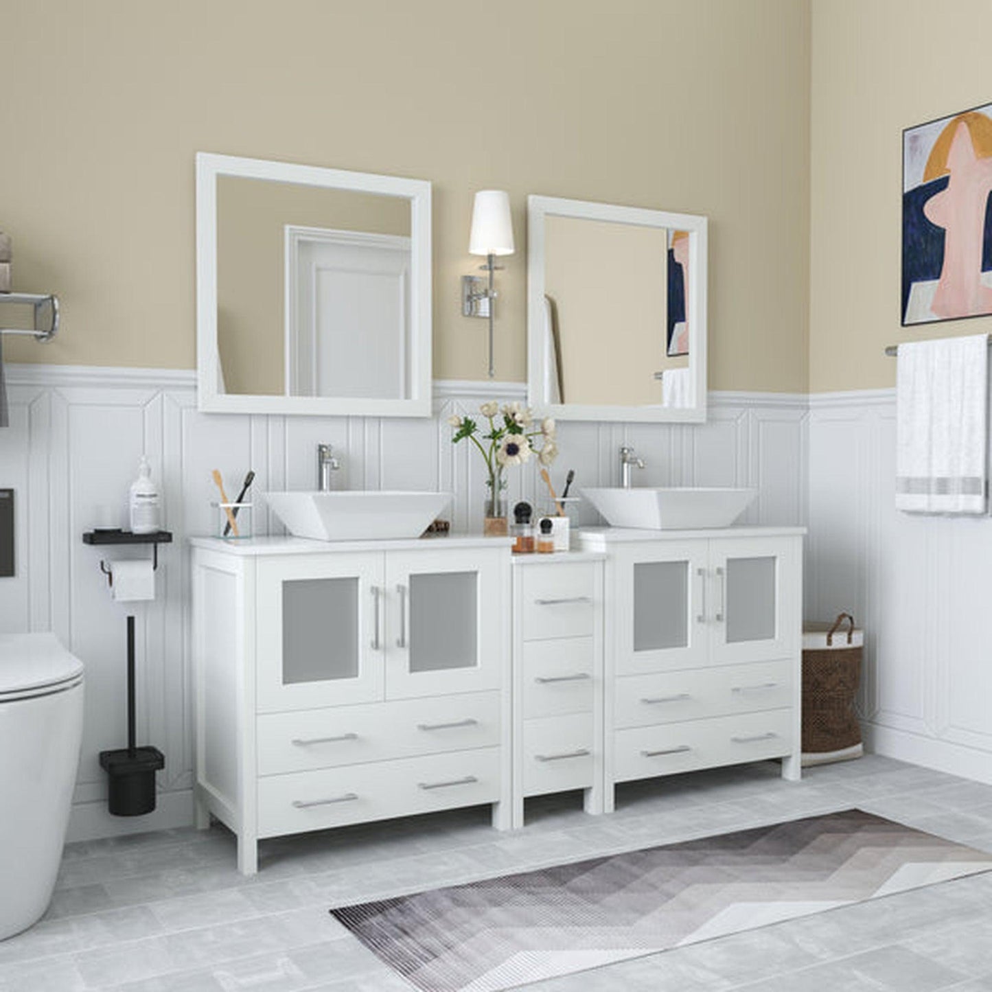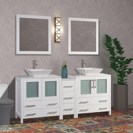 Vanity Art Ravenna 72" Double White Freestanding Vanity Set With White Engineered Marble Top, Ceramic Vessel Sink, 1 Side Cabinet and 2 Mirrors