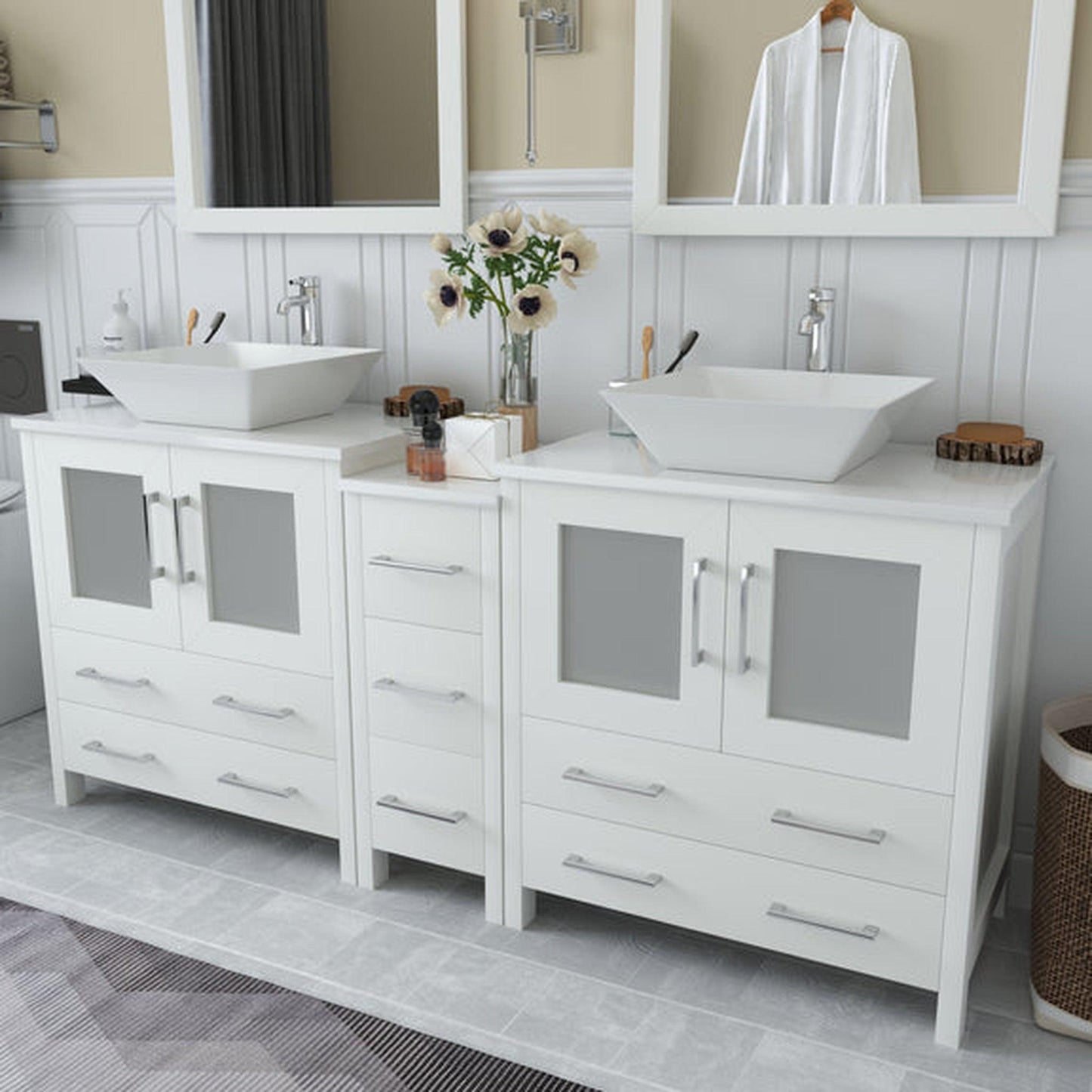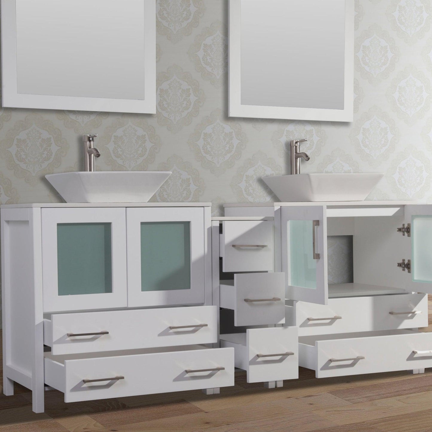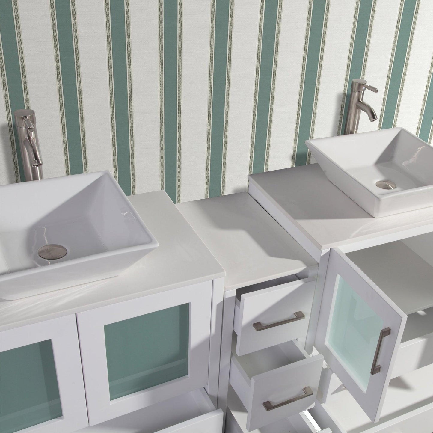 Vanity Art Ravenna 72" Double White Freestanding Vanity Set With White Engineered Marble Top, Ceramic Vessel Sink, 1 Side Cabinet and 2 Mirrors