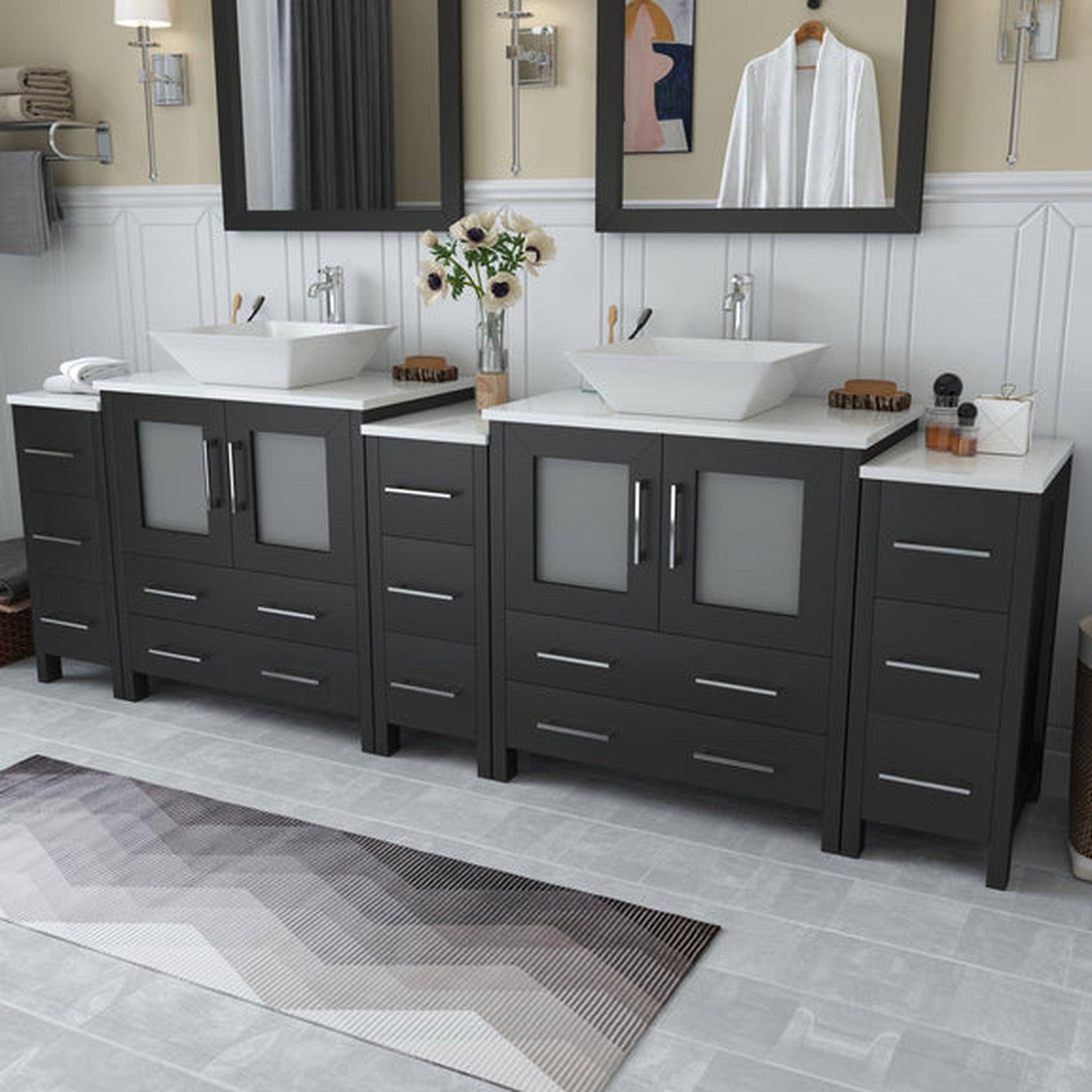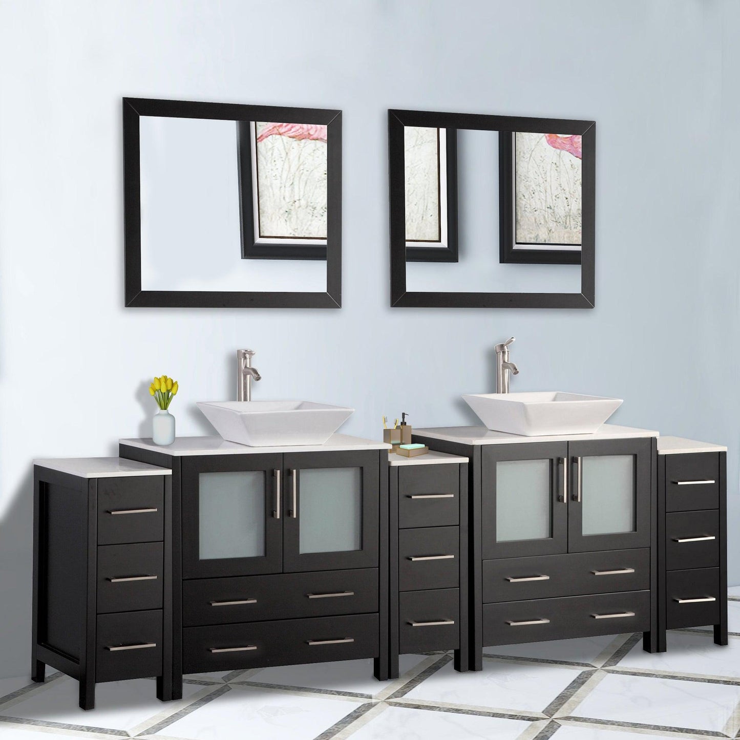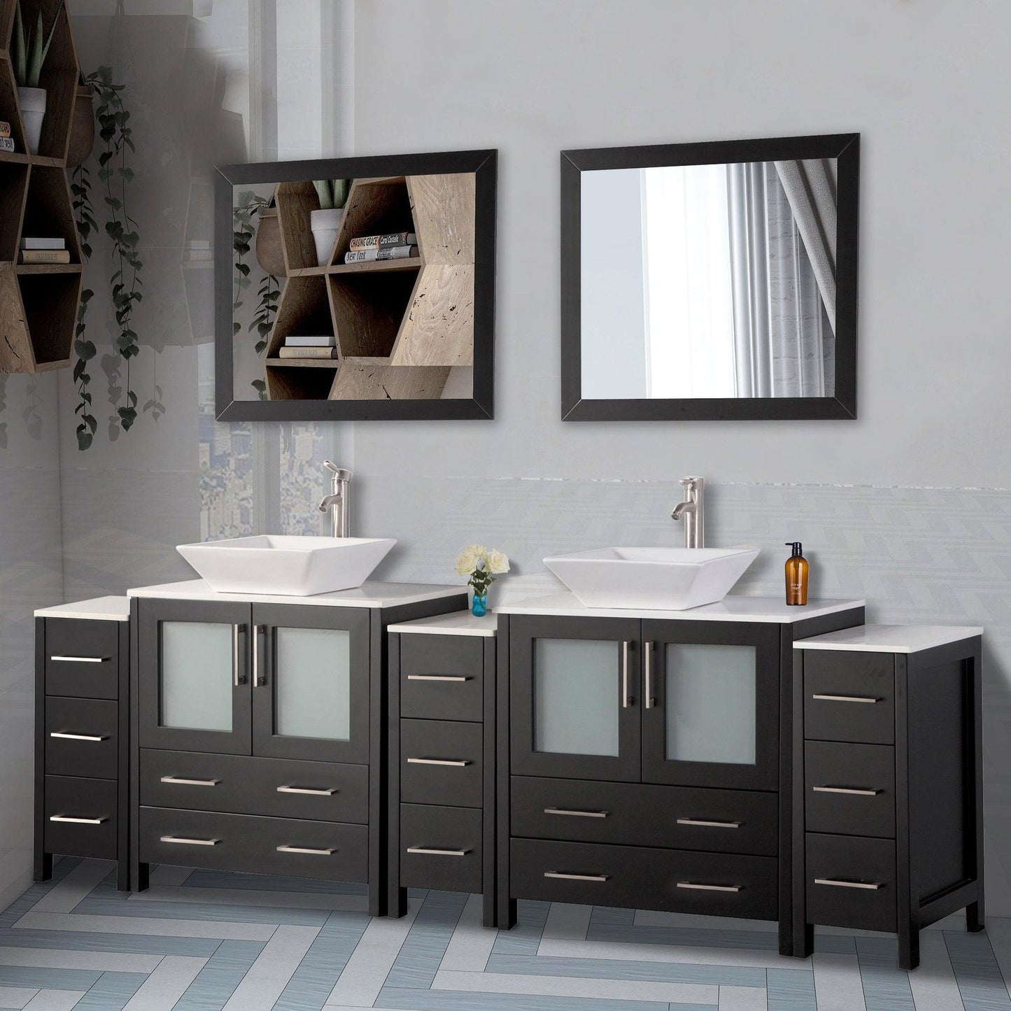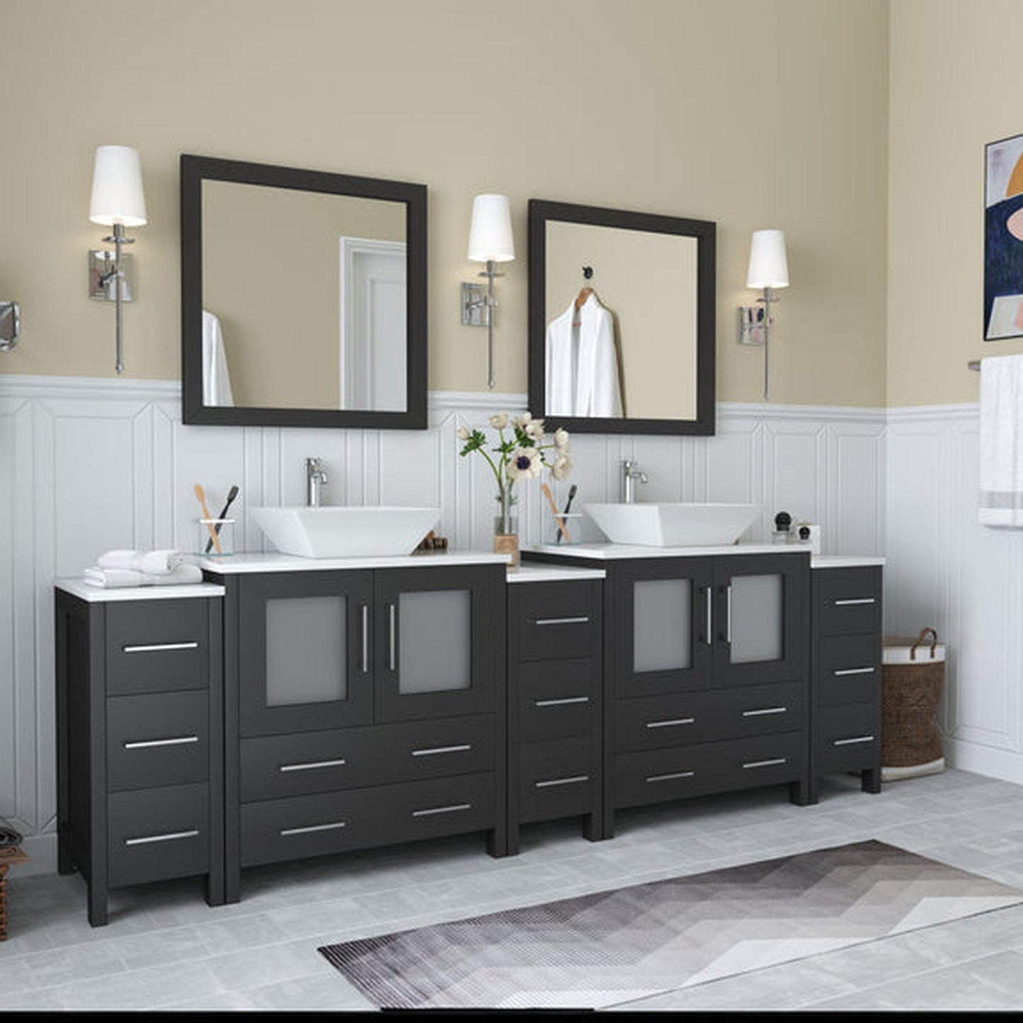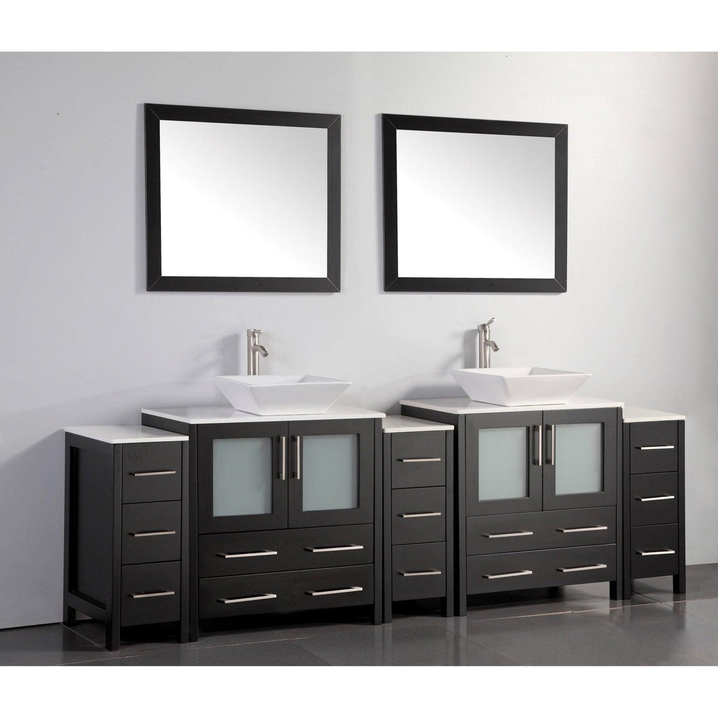 Vanity Art Ravenna 96" Double Espresso Freestanding Vanity Set With White Engineered Marble Top, 2 Ceramic Vessel Sinks, 3 Side Cabinets and 2 Mirrors