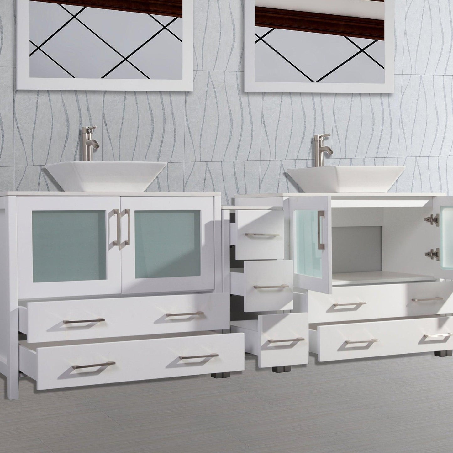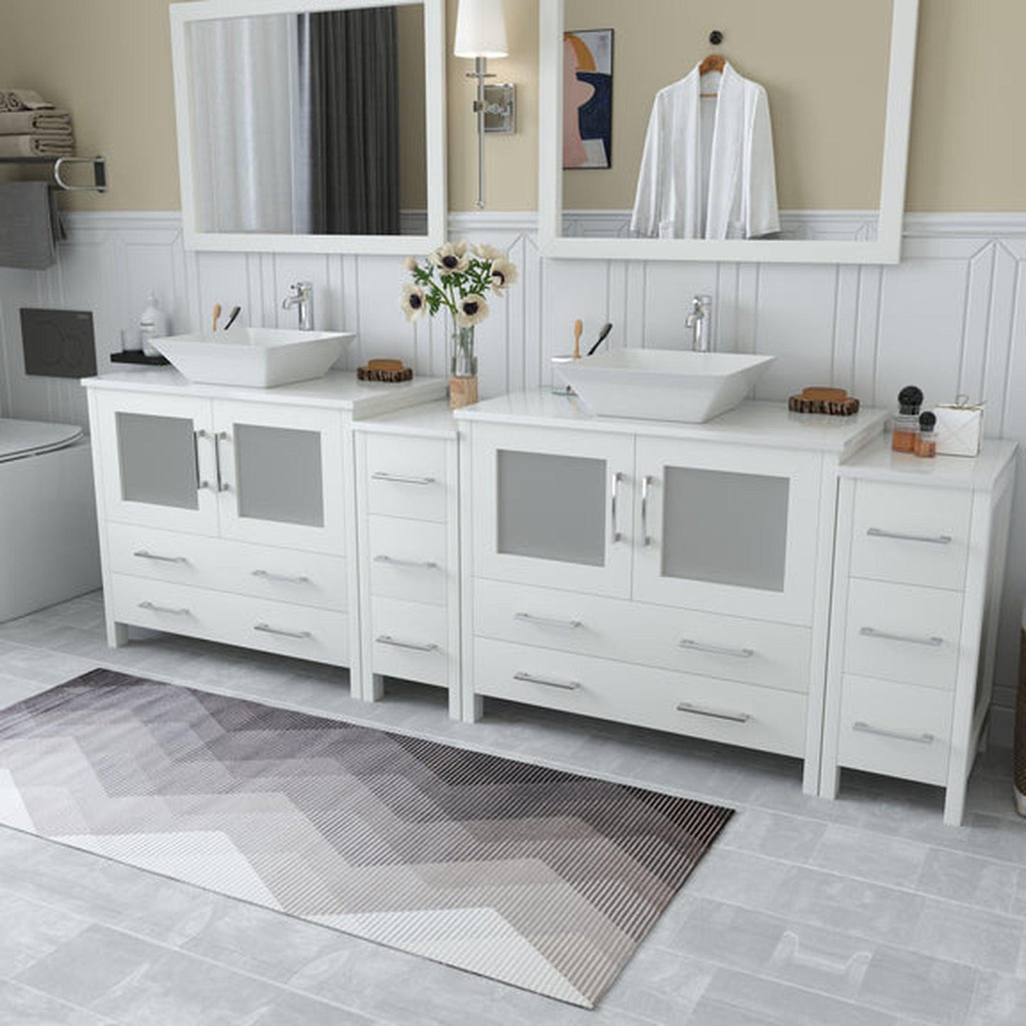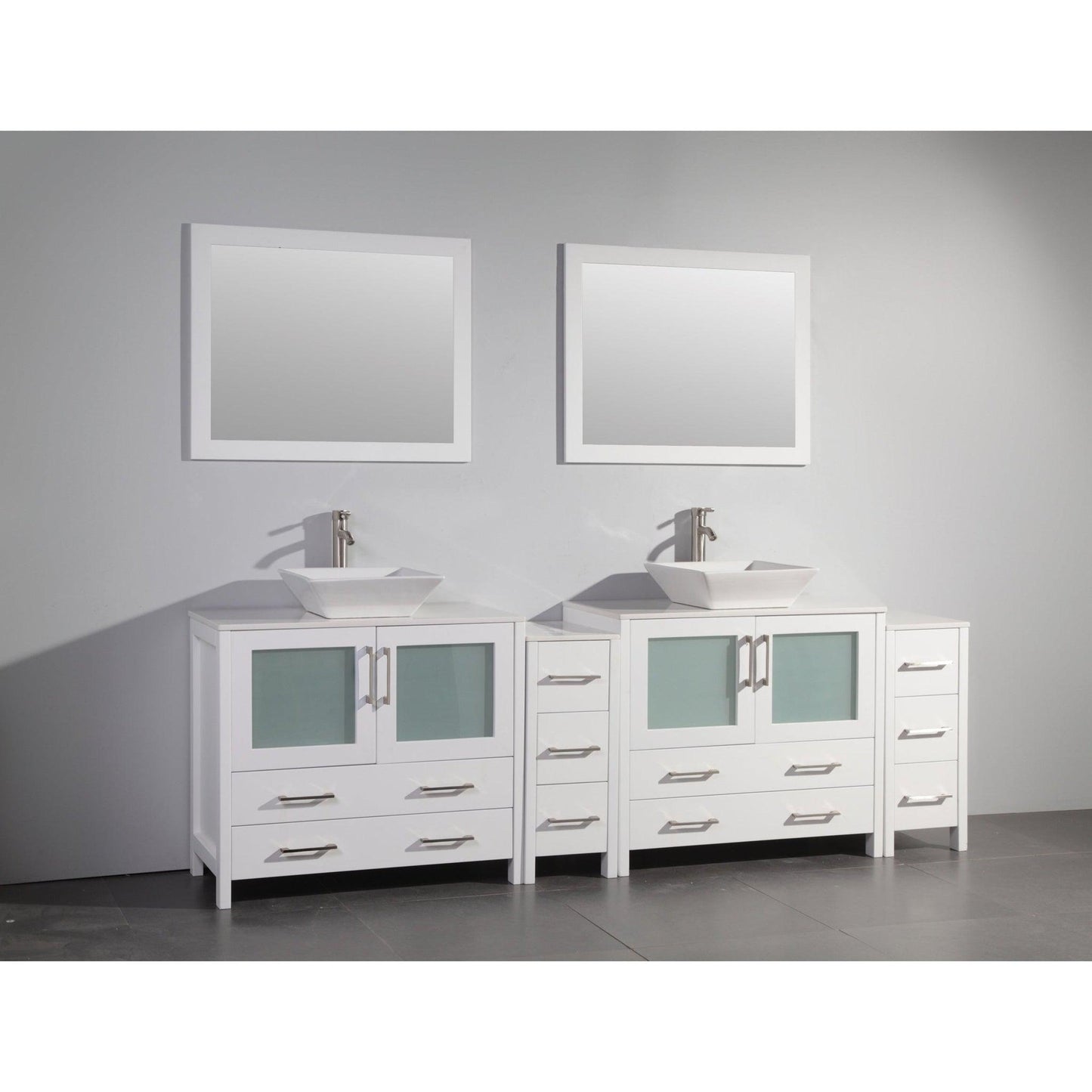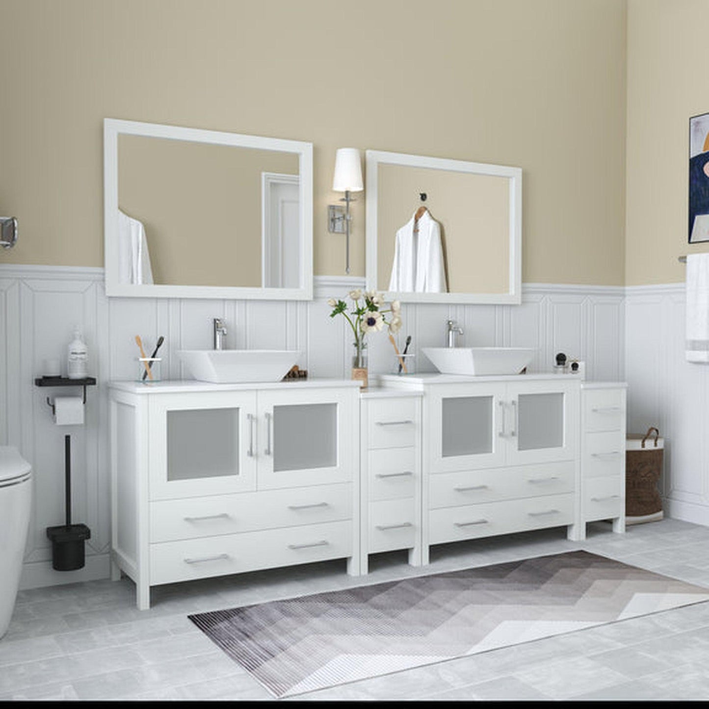 Vanity Art Ravenna 96" Double White Freestanding Vanity Set With White Engineered Marble Top, 2 Ceramic Vessel Sinks, 2 Side Cabinets and 2 Mirrors