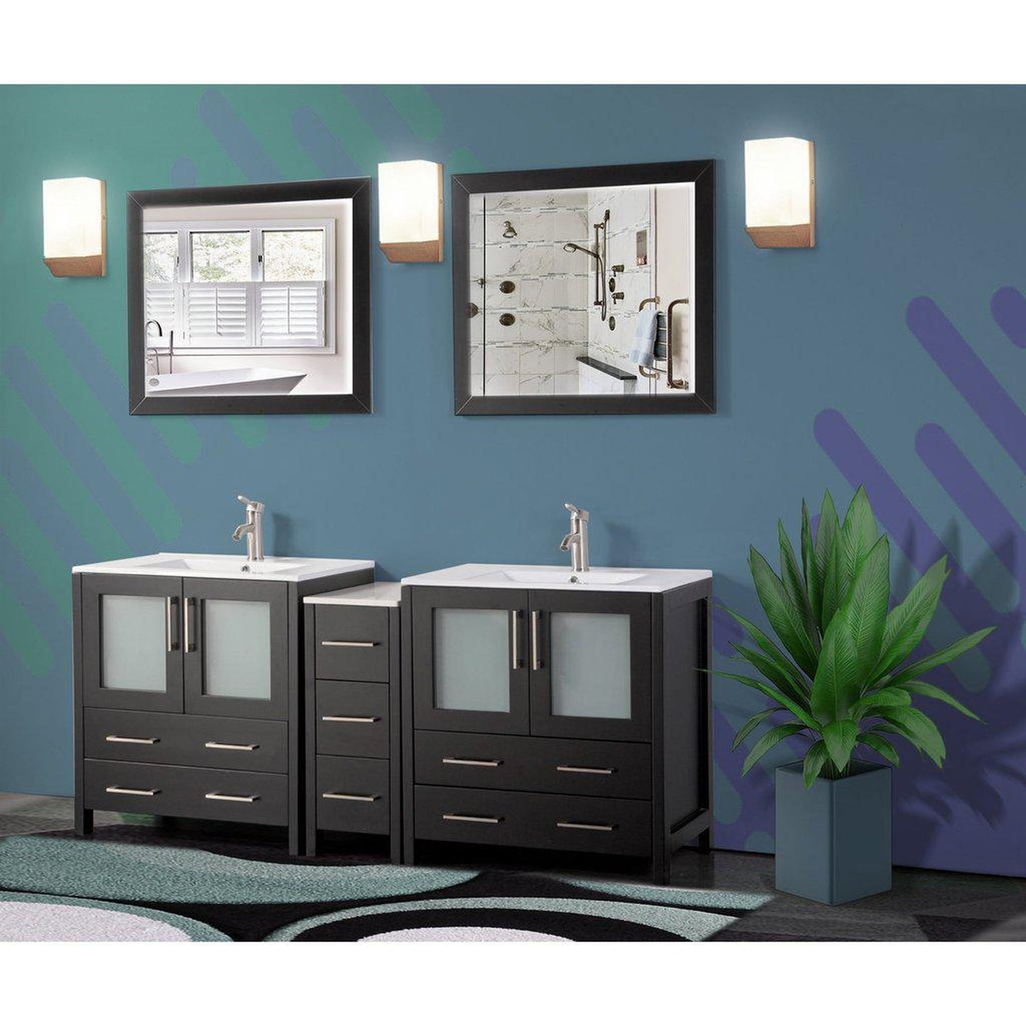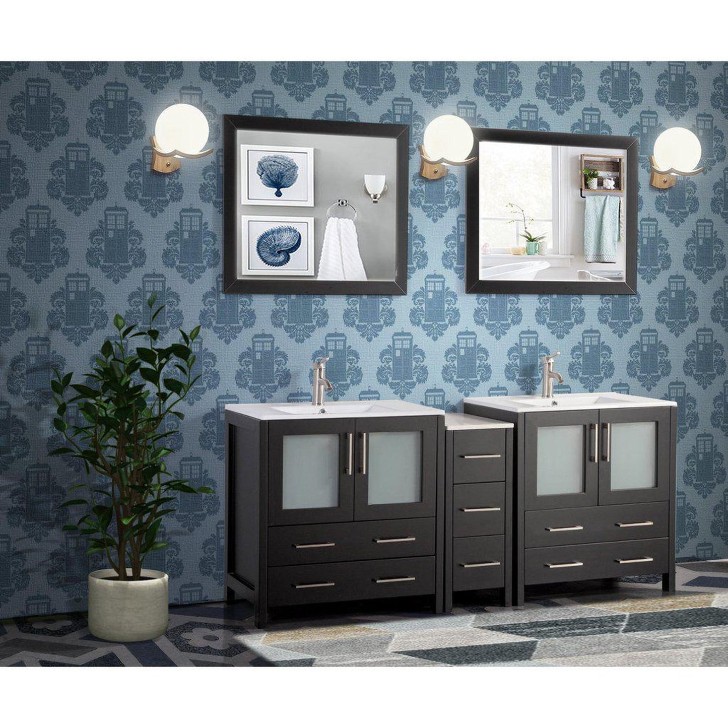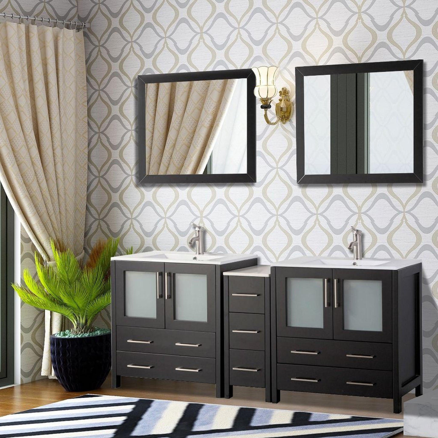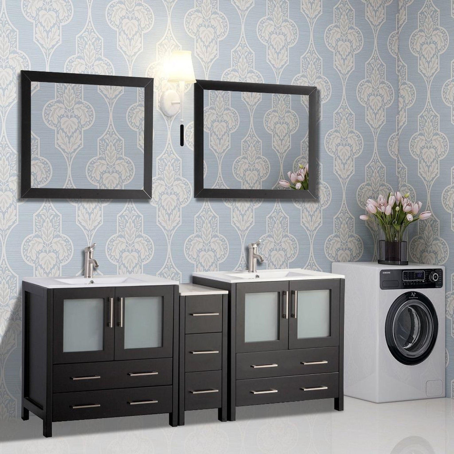 Update your bathroom with this ceramic vanity set. White ceramic top contrasts with the cabinet's color. Freshen up your bathroom with this storage vanity sink. Vanity Art 72-inch double sink bathroom vanity set offers an eye-catching focal point to your bathroom ensemble while increasing storage space. Boasting a solid neutral finish features seven drawers and three cabinets for keeping crisp towels, cleaning supplies, and other bathroom essentials. A matching framed mirror is also included.