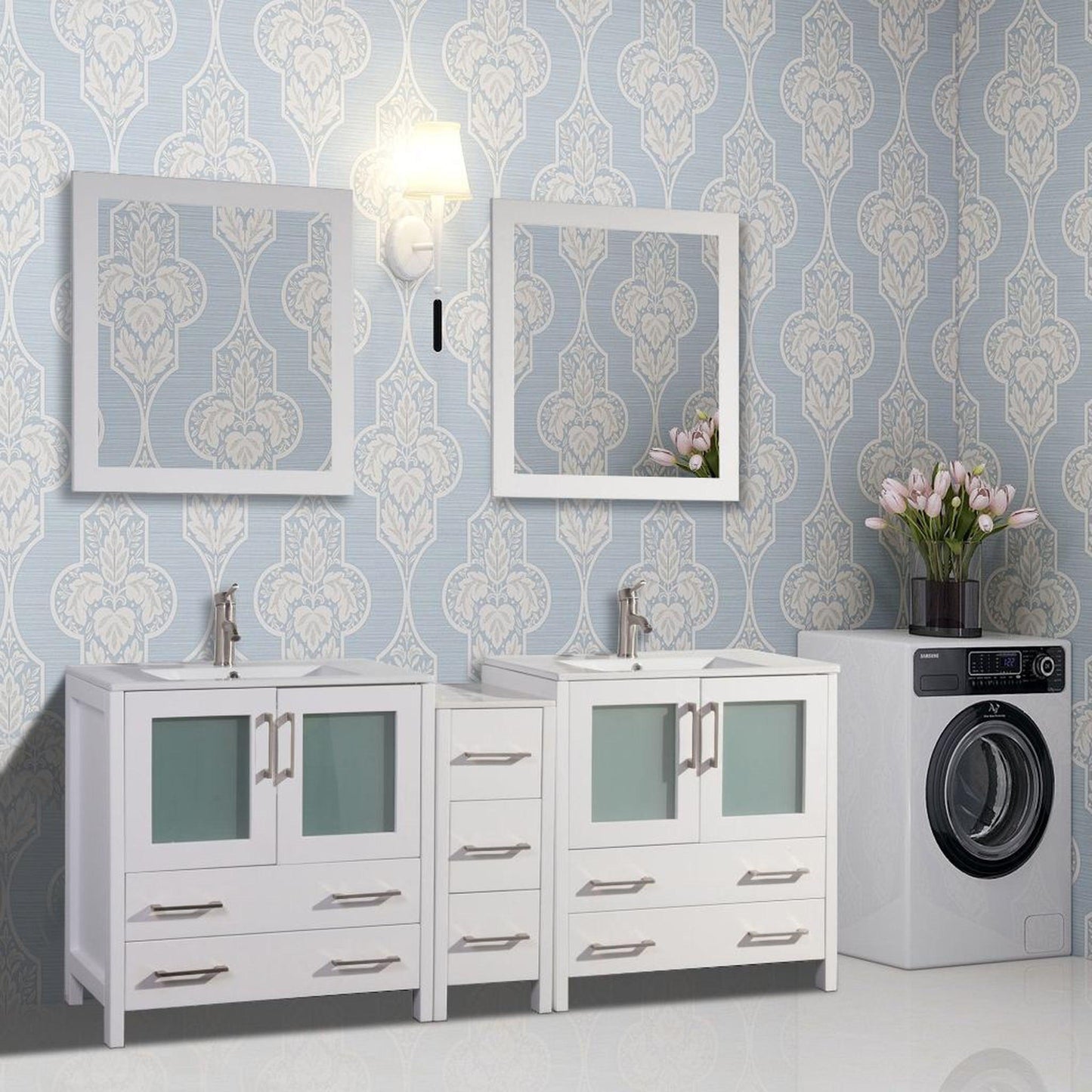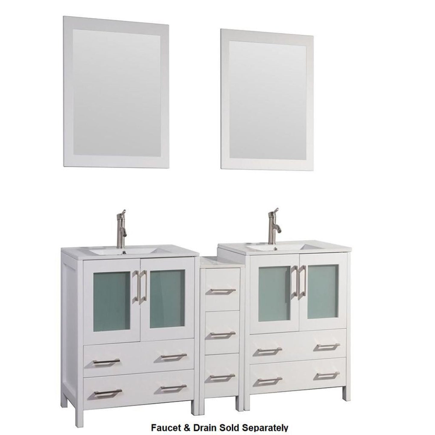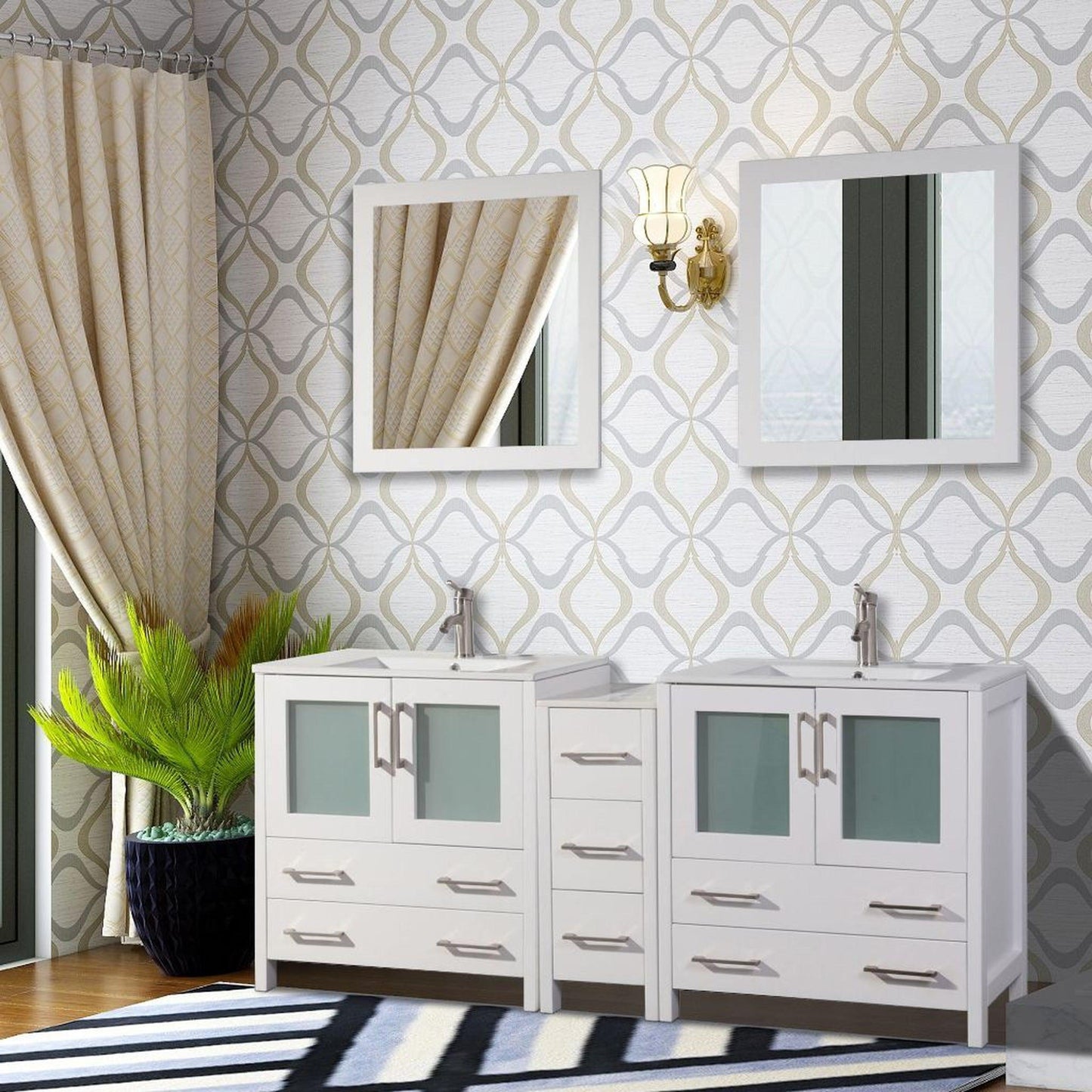 Update your bathroom with this ceramic vanity set. White ceramic top contrasts with the cabinet's color. Freshen up your bathroom with this storage vanity sink. Vanity Art 72-inch double sink bathroom vanity set offers an eye-catching focal point to your bathroom ensemble while increasing storage space. Boasting a solid neutral finish features seven drawers and three cabinets for keeping crisp towels, cleaning supplies, and other bathroom essentials. A matching framed mirror is also included.