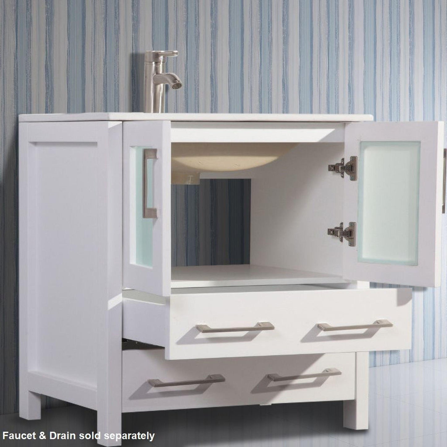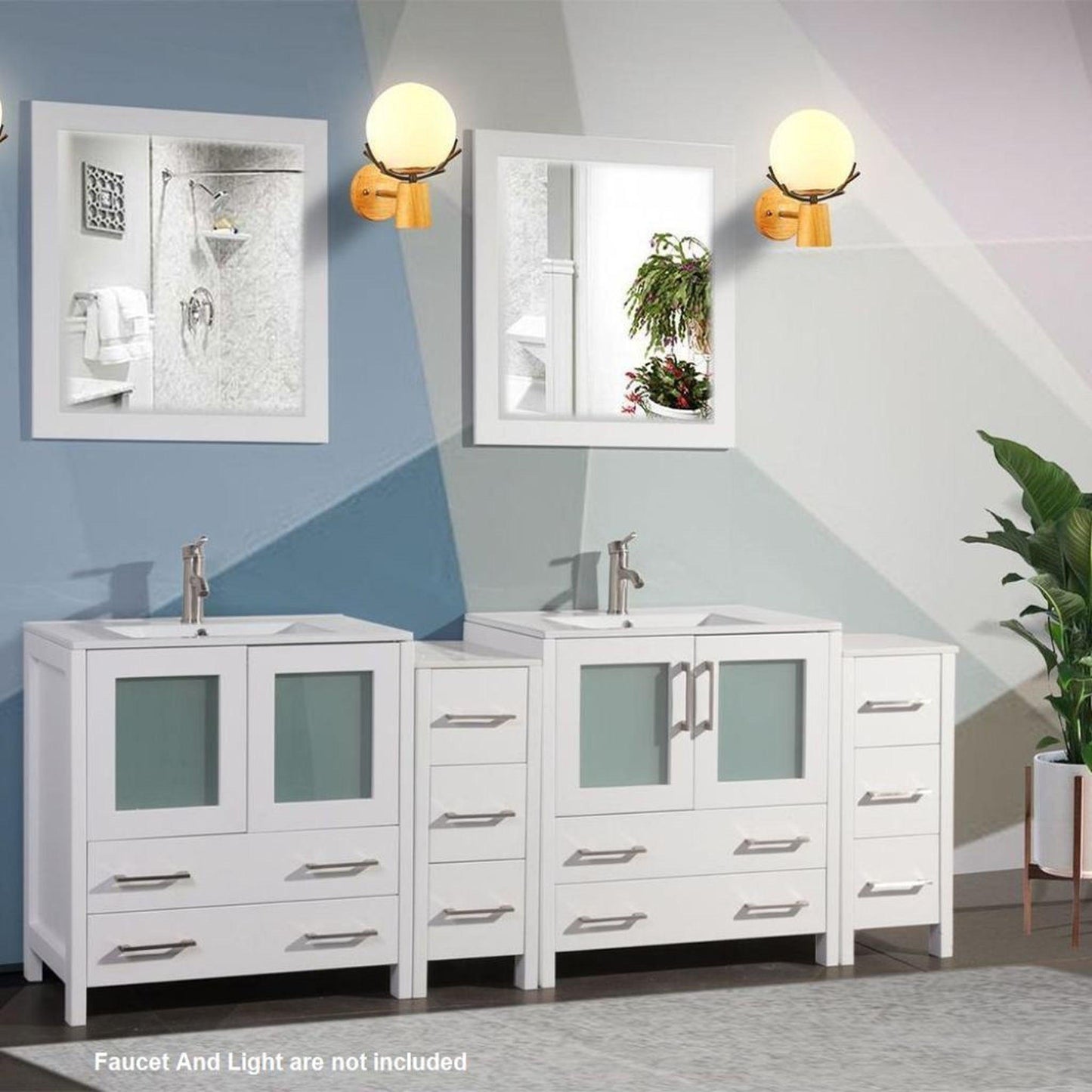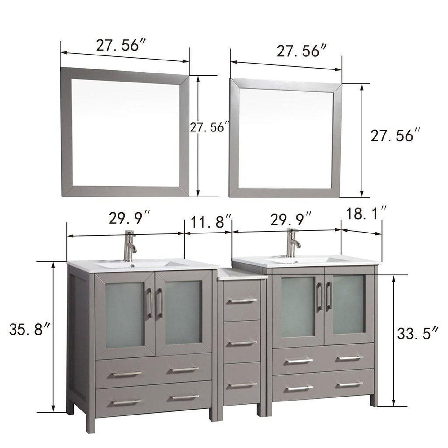 Update your bathroom with this ceramic vanity set. White ceramic top contrasts with the cabinet's color. Freshen up your bathroom with this storage vanity sink. Vanity Art 72-inch double sink bathroom vanity set offers an eye-catching focal point to your bathroom ensemble while increasing storage space. Boasting a solid neutral finish features seven drawers and three cabinets for keeping crisp towels, cleaning supplies, and other bathroom essentials. A matching framed mirror is also included.