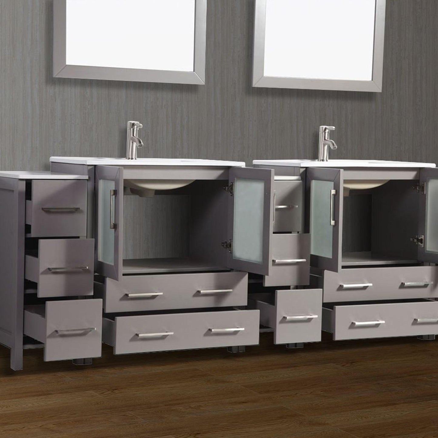 Update your bathroom with this ceramic vanity set. White ceramic top contrasts with the cabinet's color. Freshen up your bathroom with this storage vanity sink. Vanity art 96-inch double sink bathroom vanity set offers an eye-catching focal point to your bathroom ensemble while increasing storage space. Boasting a solid neutral finish features thirteen drawers and five cabinets for keeping crisp towels, cleaning supplies, and other bathroom essentials. A matching framed mirror is also included.
