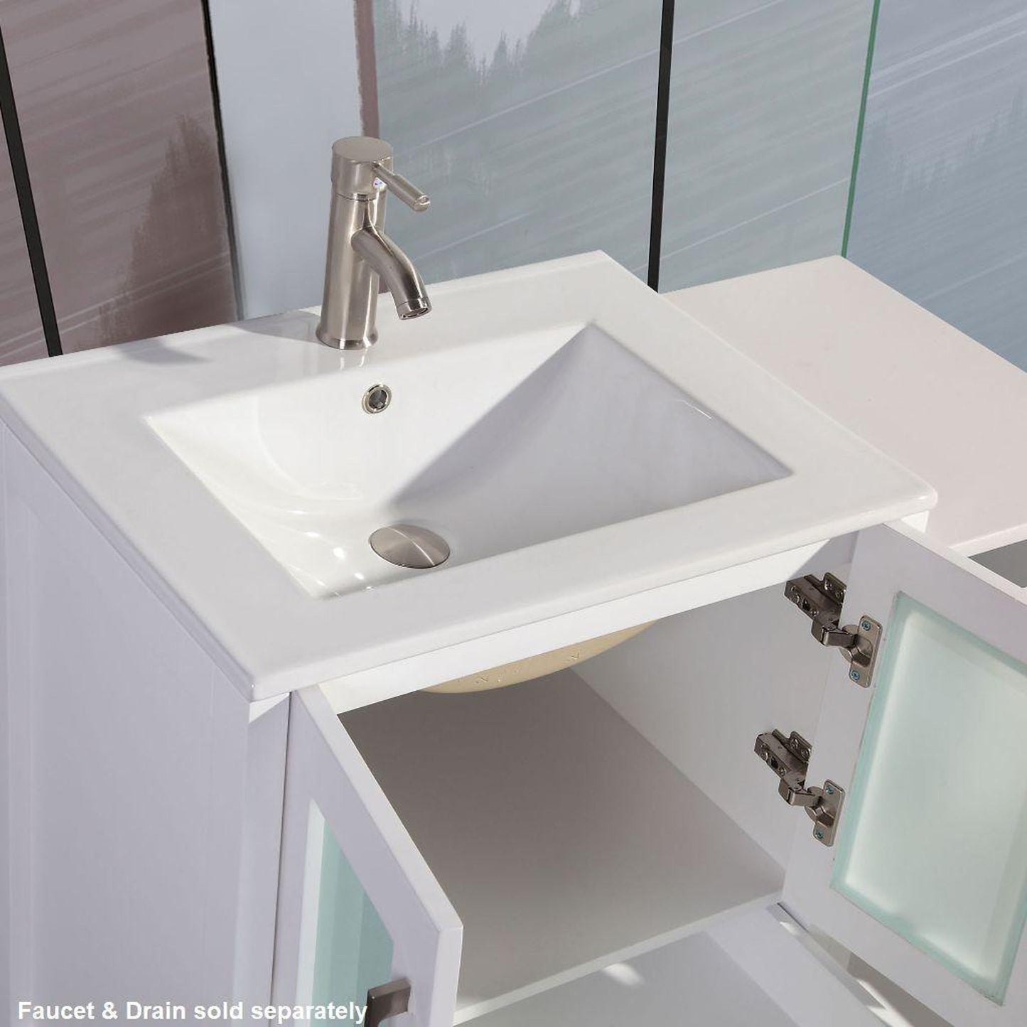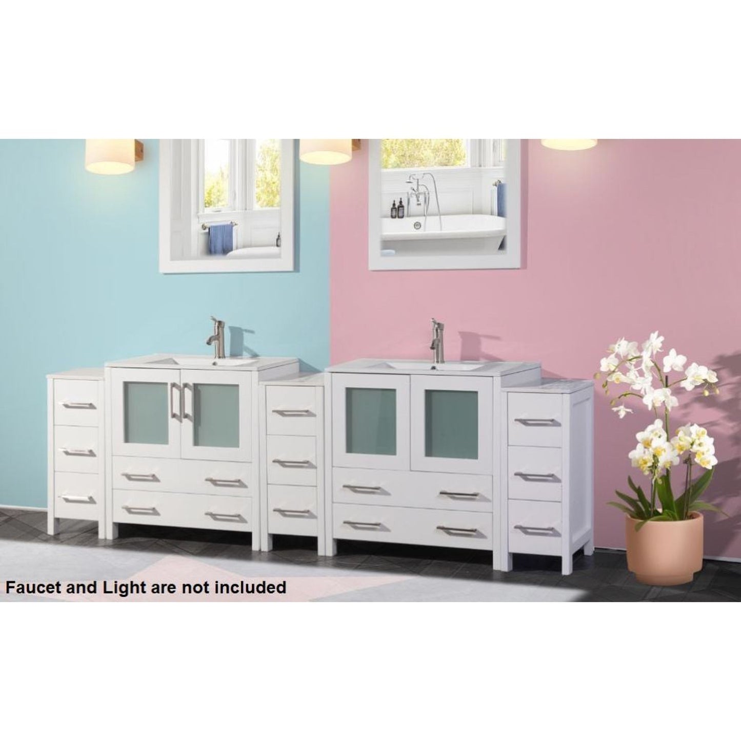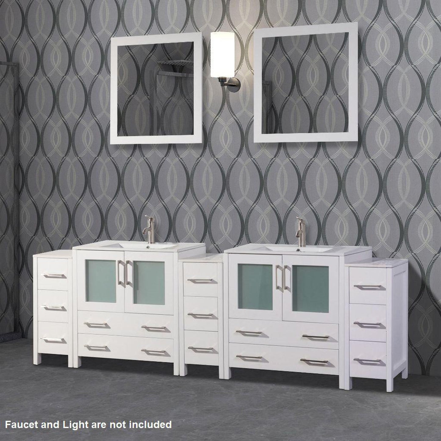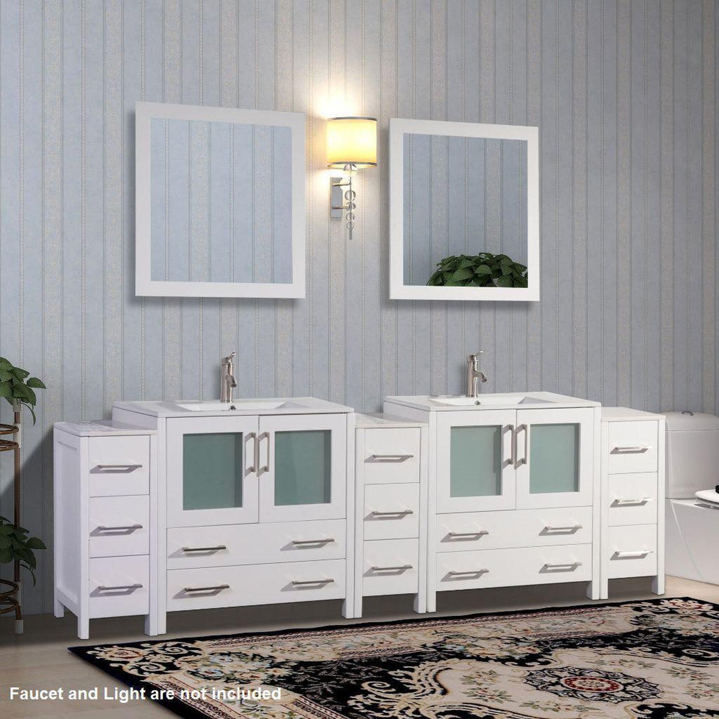 Update your bathroom with this ceramic vanity set. White ceramic top contrasts with the cabinet's color. Freshen up your bathroom with this storage vanity sink. Vanity art 96-inch double sink bathroom vanity set offers an eye-catching focal point to your bathroom ensemble while increasing storage space. Boasting a solid neutral finish features thirteen drawers and five cabinets for keeping crisp towels, cleaning supplies, and other bathroom essentials. A matching framed mirror is also included.