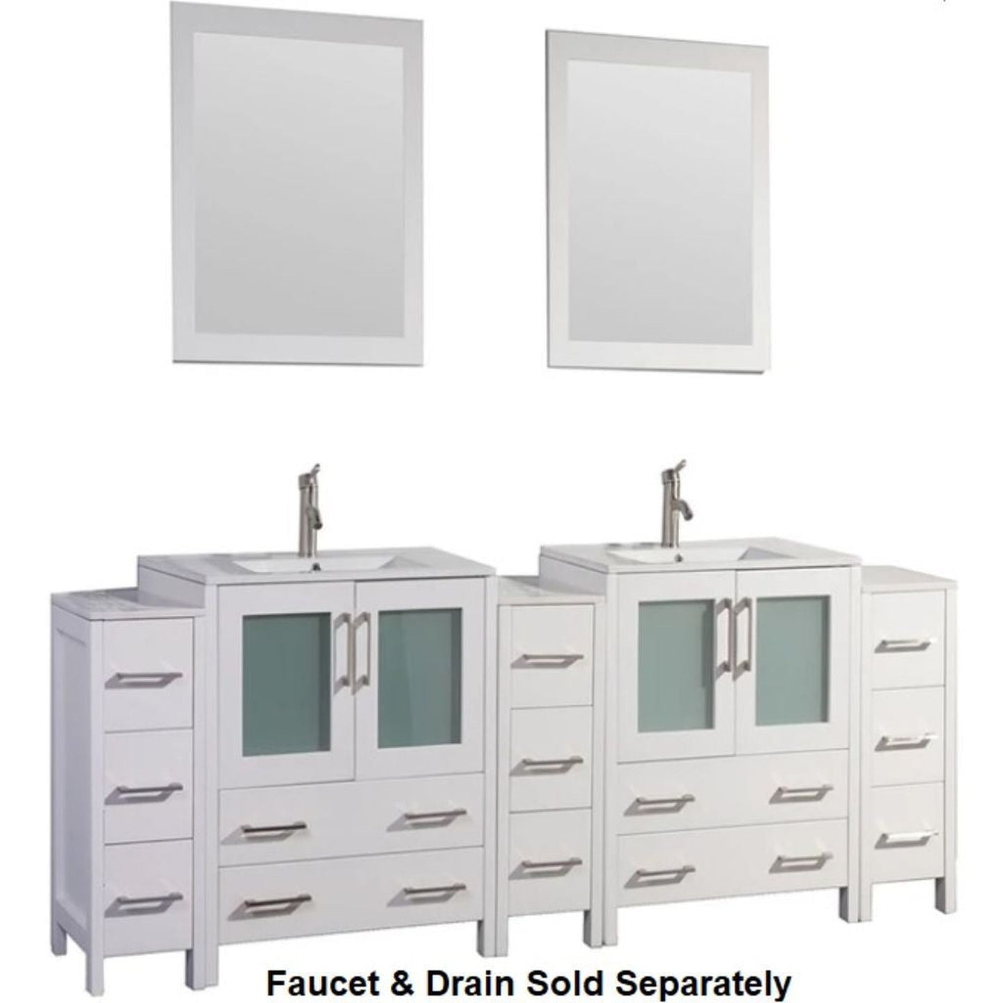 Set includes 96-inch double bathroom vanity set with mirror ceramic vanity top set includes 2 large folding doors, 2 Shelves, 5 Cabinets, and 13 drawers. Soft closing doors and dovetailed drawers is a perfect combination of elegance and value for your bathroom.