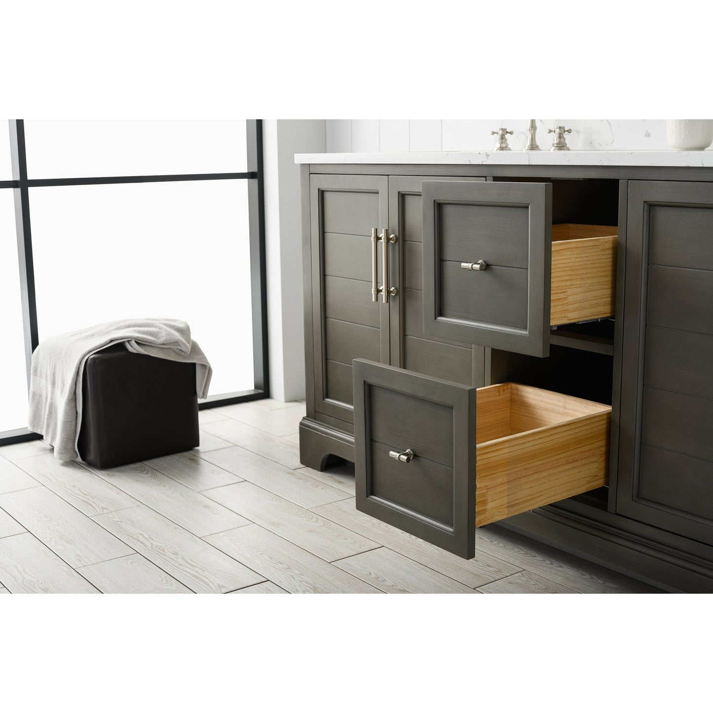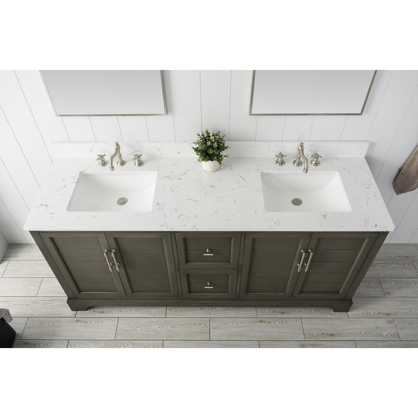 The classic clean lines and elegant styling of the 72-inch 3-hole bathroom vanity will infuse your bathroom with a calming, light, and airy feel. Designed to enhance a large size bathroom with a strong contemporary look with big character in a compact size. Beneath a lustrous and durable engineered marble countertop is a beautifully integrated rectangular ceramic sink. Equipped with soft-closing cabinet doors and dovetailed drawers with gleaming brushed nickel finished hardware, and silver-gray, white, vintage green vanity finish with a lacquer coating for extra flair and stability. Comes with a manufacturer's 1-year limited warranty.