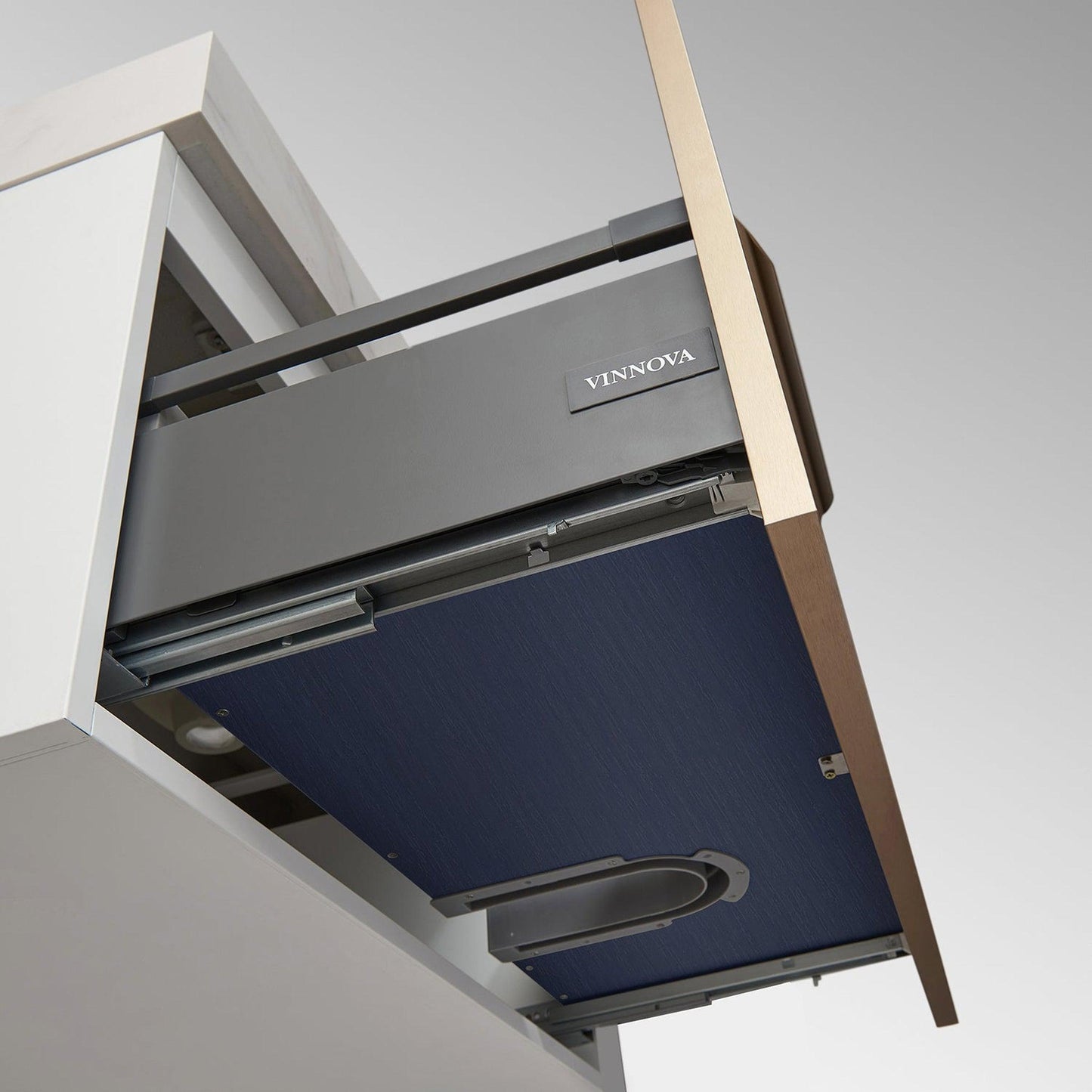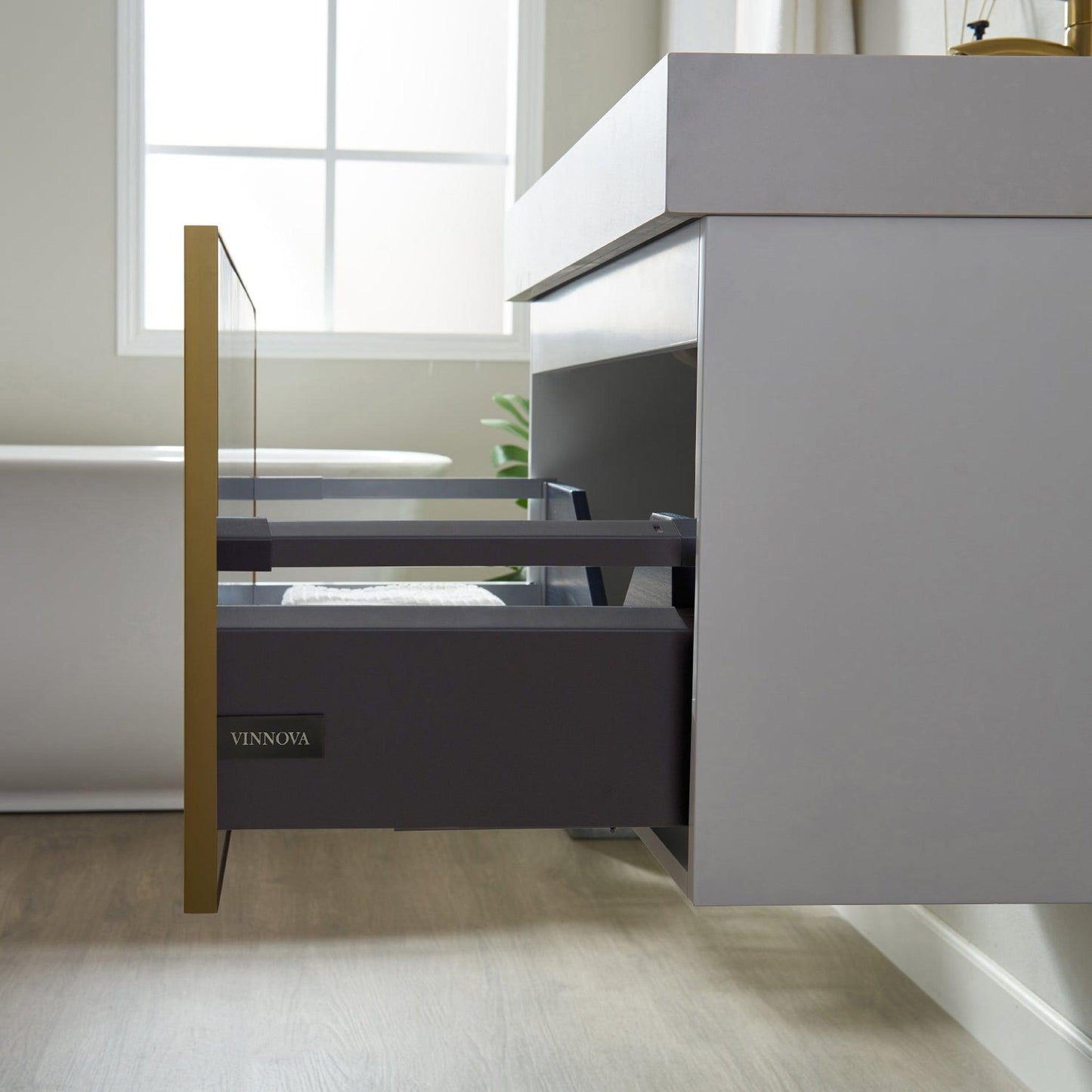 Crafted from stainless steel and solid wood, the Alicante Vanity Series by Vinnova features a clean, stunning design with gold and marble-like accents. This unique piece attaches directly to the wall to create a sleek, minimalistic profile that’s perfect for an ultra-modern space. You’ll love the oversized drawer that holds toiletries and more.