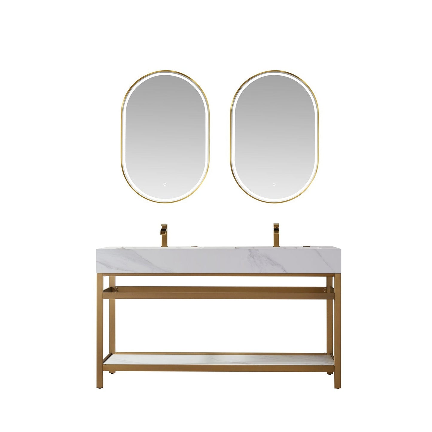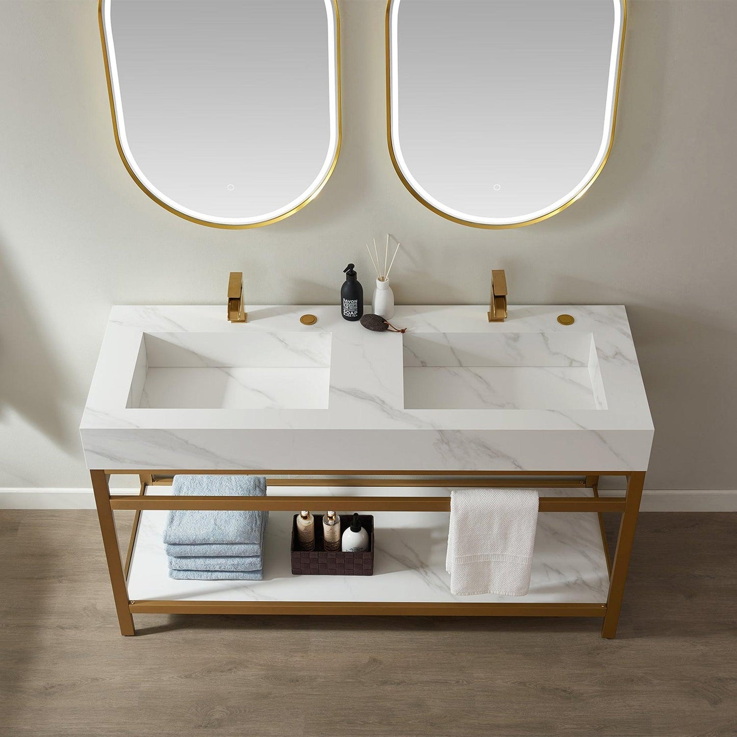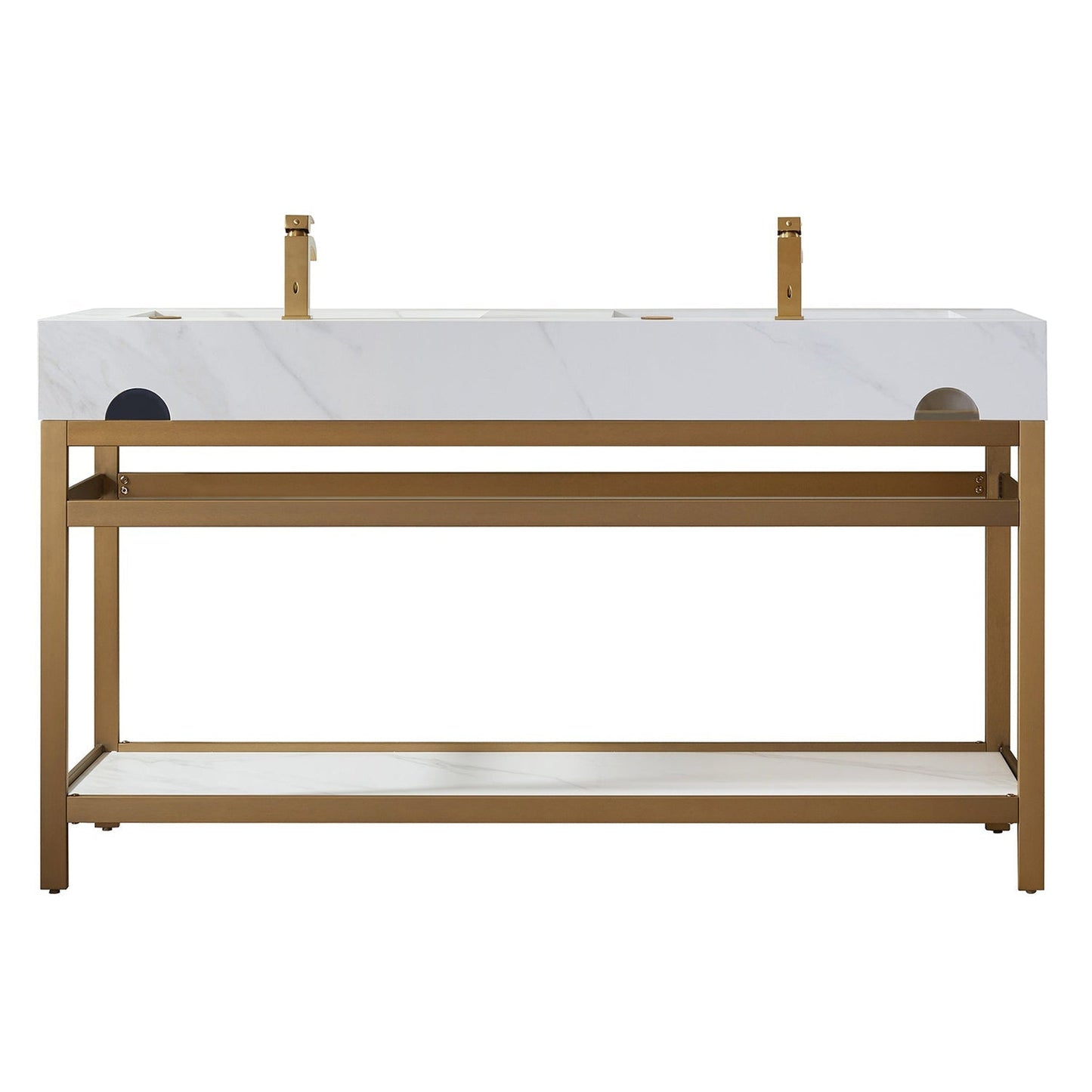 Vinnova Bilbao 60" Double Vanity With Brushed Gold Stainless Steel Bracket Match With Snow Mountain White Stone Countertop With Mirror