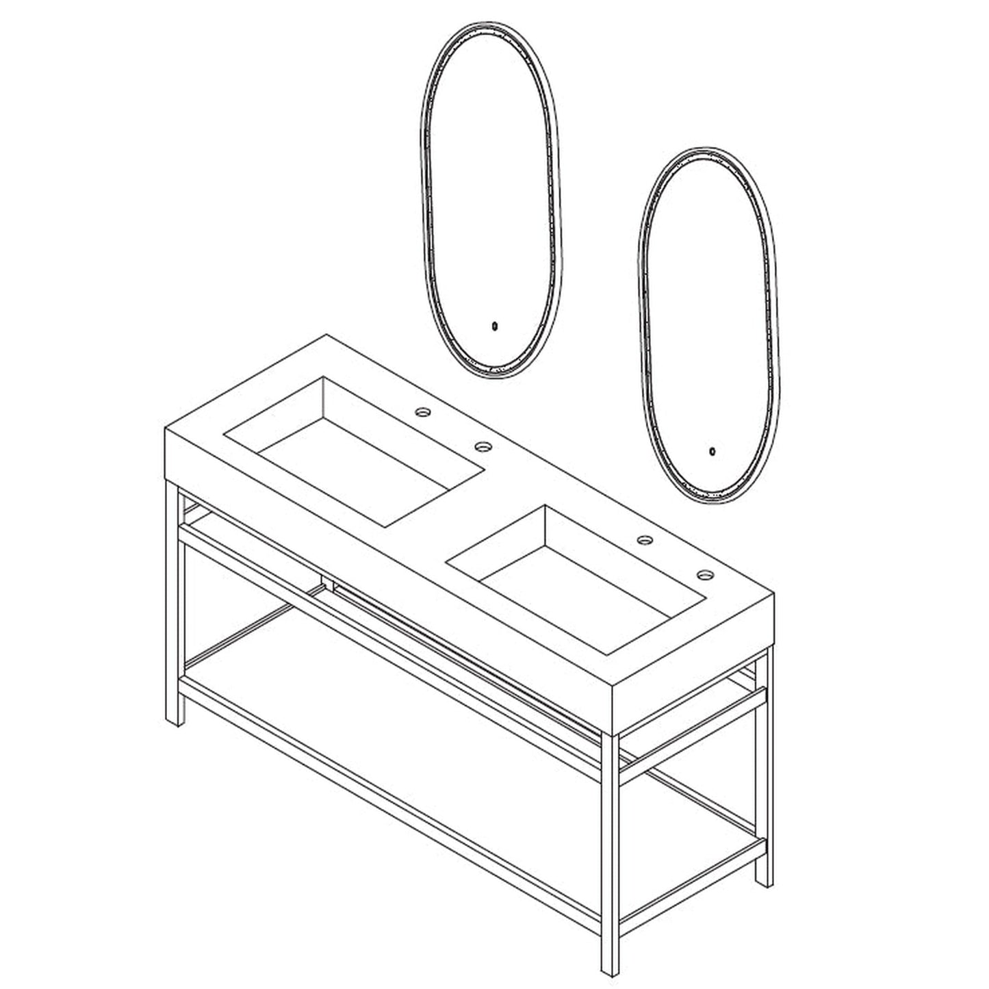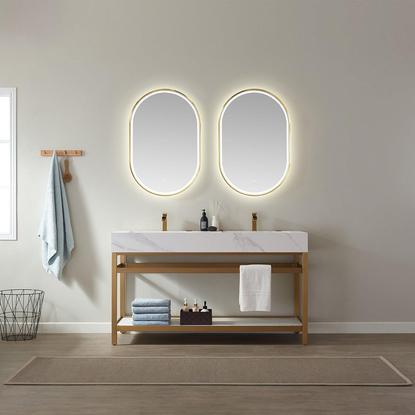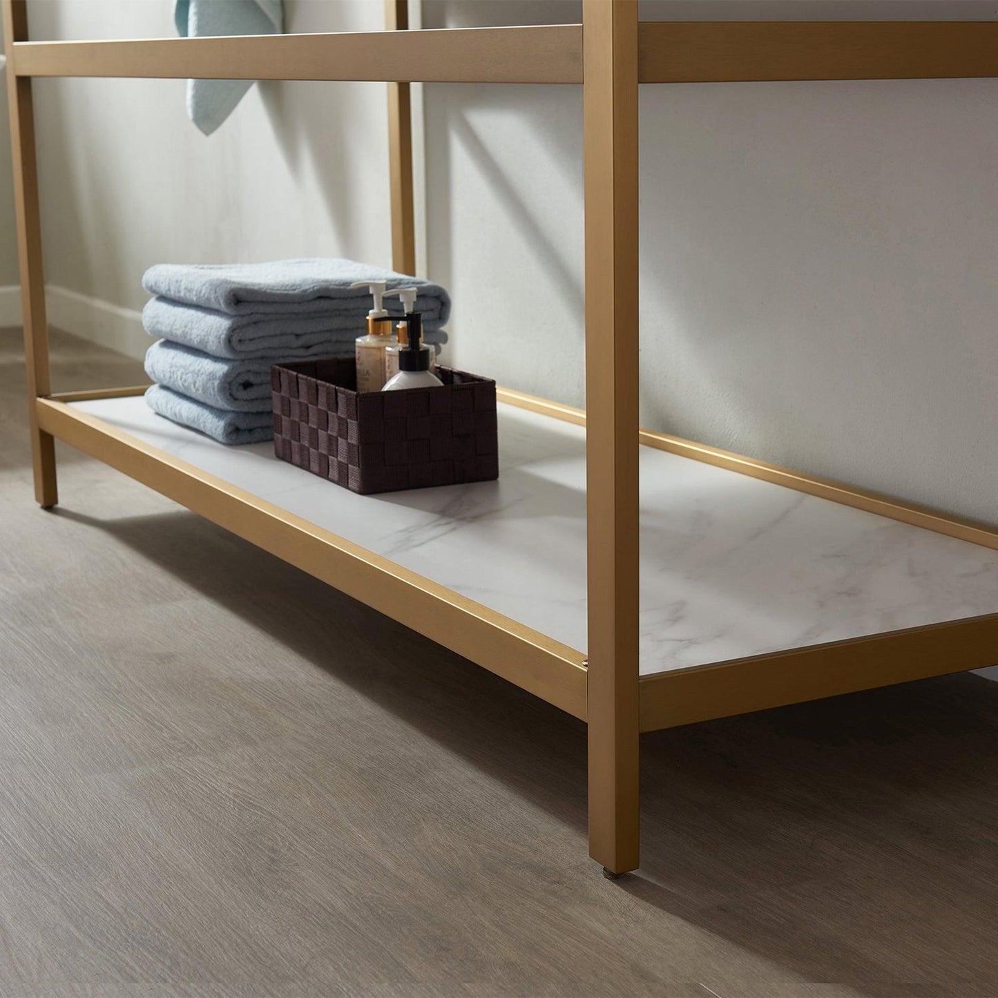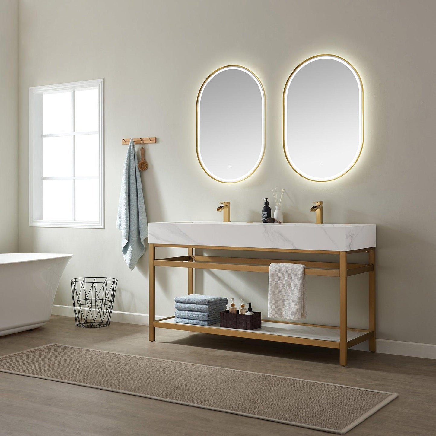 Vinnova Bilbao 60" Double Vanity With Brushed Gold Stainless Steel Bracket Match With Snow Mountain White Stone Countertop With Mirror