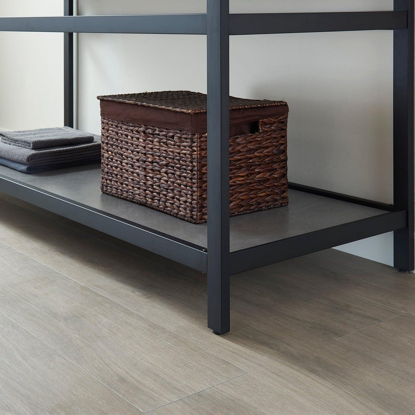 Conservative design and contemporary style come together in Vinnova’s Bilbao Vanity Series. This luxurious piece features a stunning stone top upon a Matte black frame. The open shelf beneath offers space for rolled towels or decorative items. You’ll also love the matching LED mirror that provides soft illumination for your personal routine.
