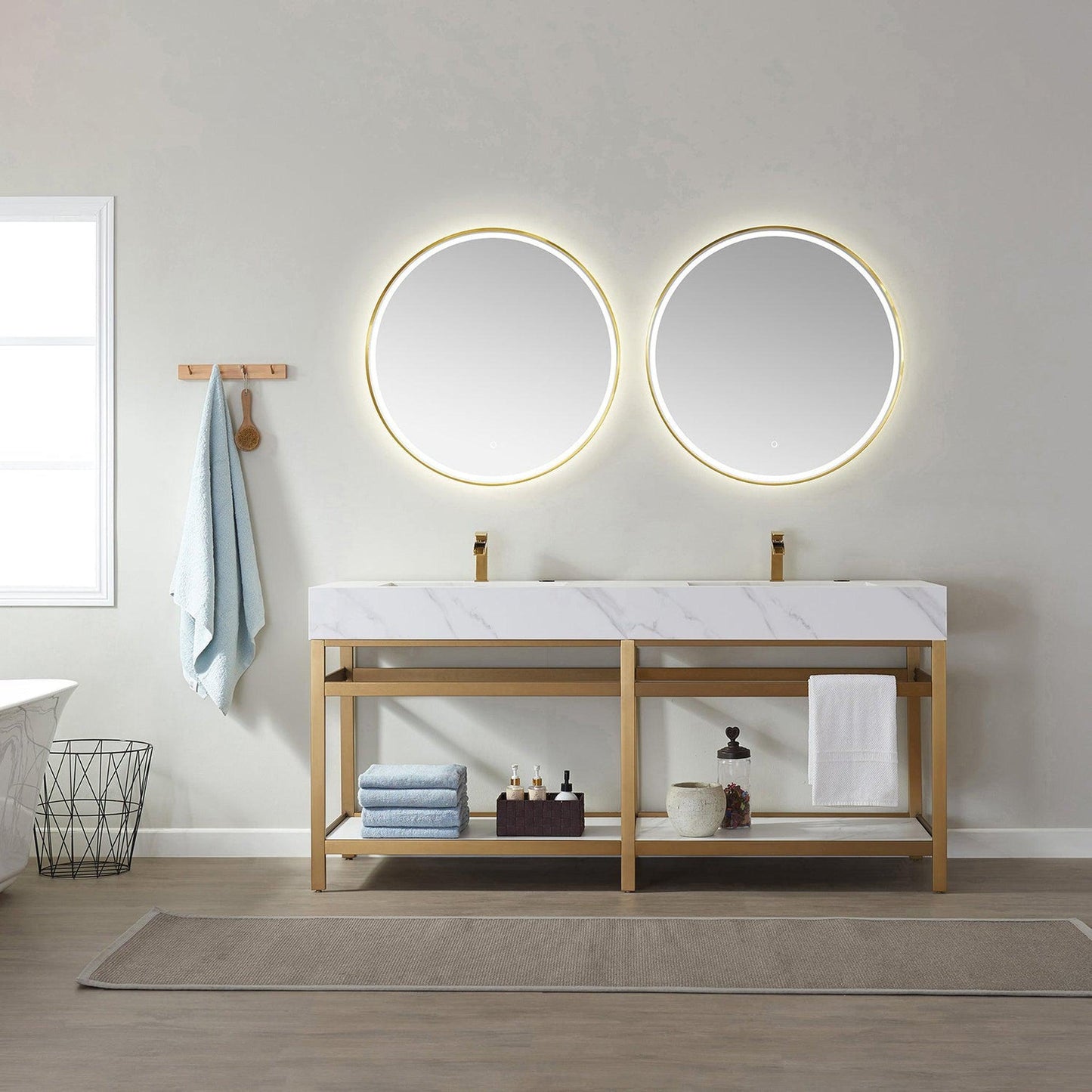 - Double, circular matching LED-framed mirrors matches vanity.
