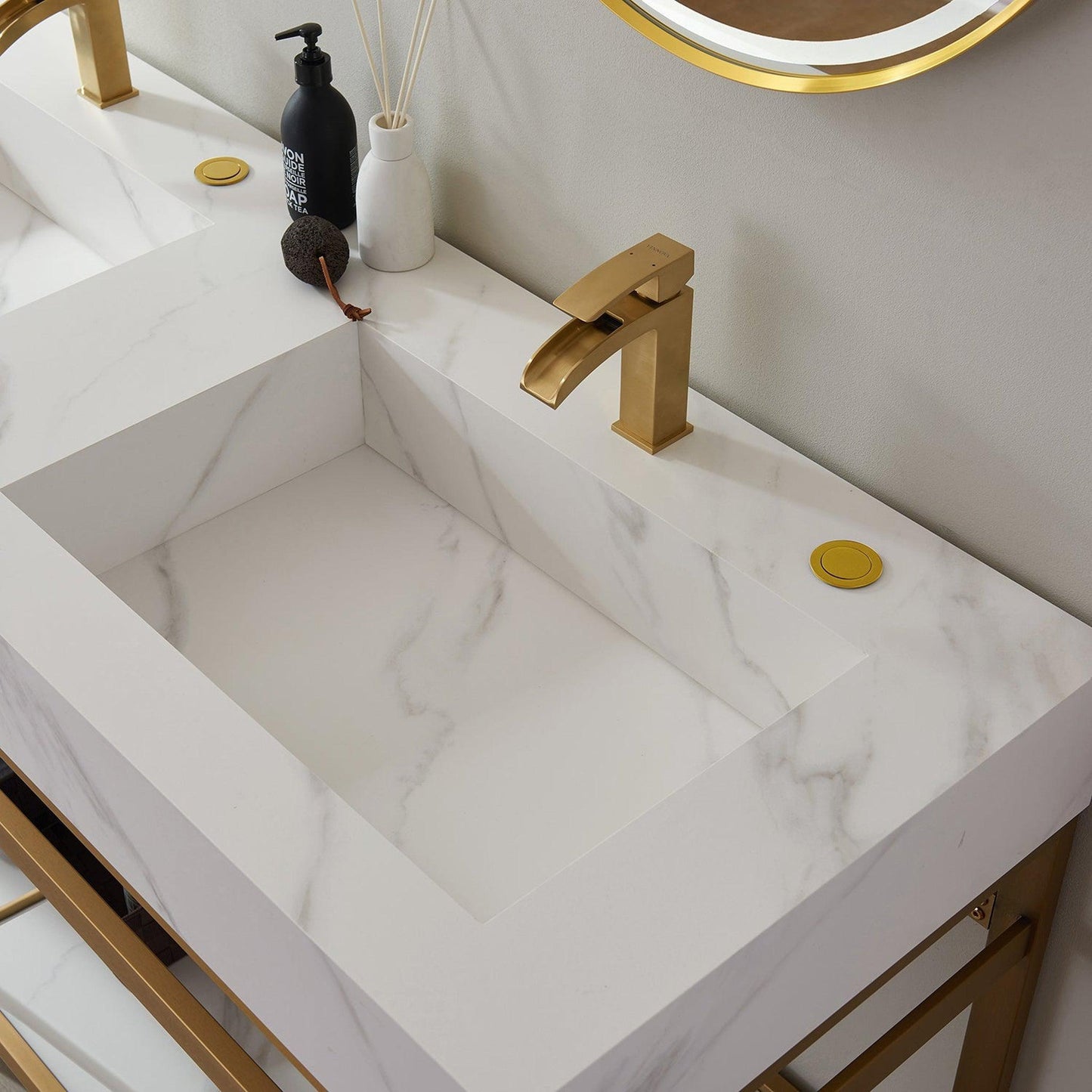 | Finish | Brushed-gold stainless steel bracket + Snow mountain-white stone |