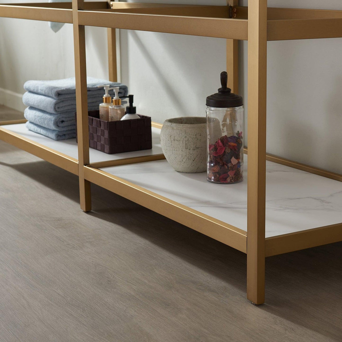 Conservative design and contemporary style come together in Vinnova’s Bilbao Vanity Series. This luxurious piece features a stunning stone top upon a brushed-gold frame. The open shelf beneath offers space for rolled towels or decorative items. You’ll also love the matching LED mirror that provides soft illumination for your personal routine.