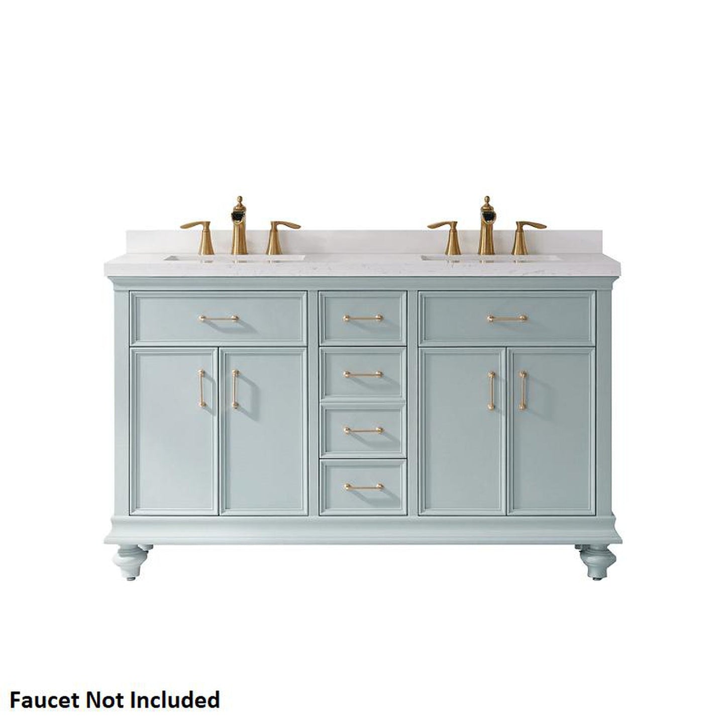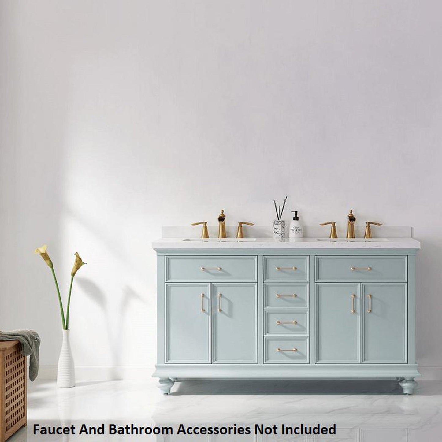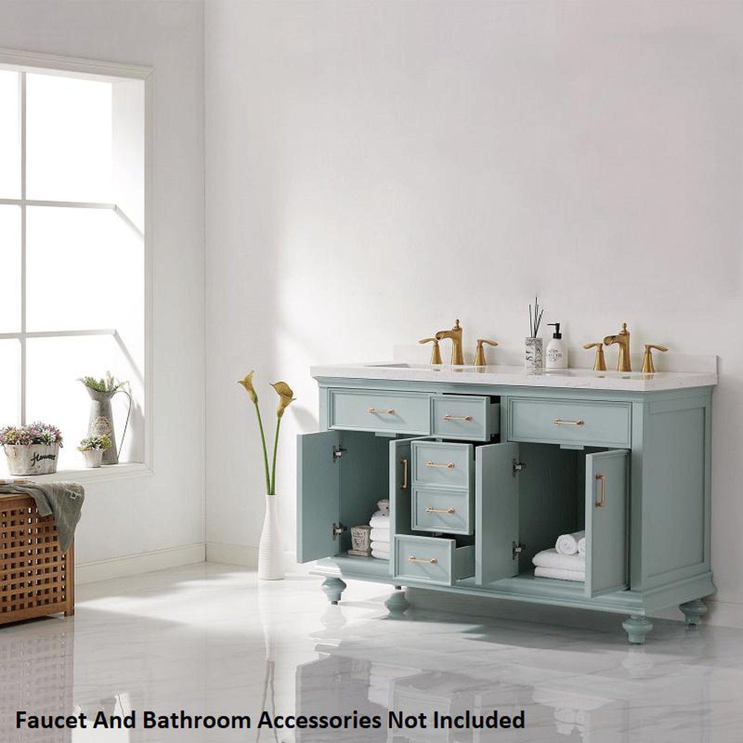 Vinnova Charlotte 60" Finnish Green Freestanding Double Vanity Set In White Carrara Composite Quartz Stone Top With Undermount Ceramic Sink and Backsplash