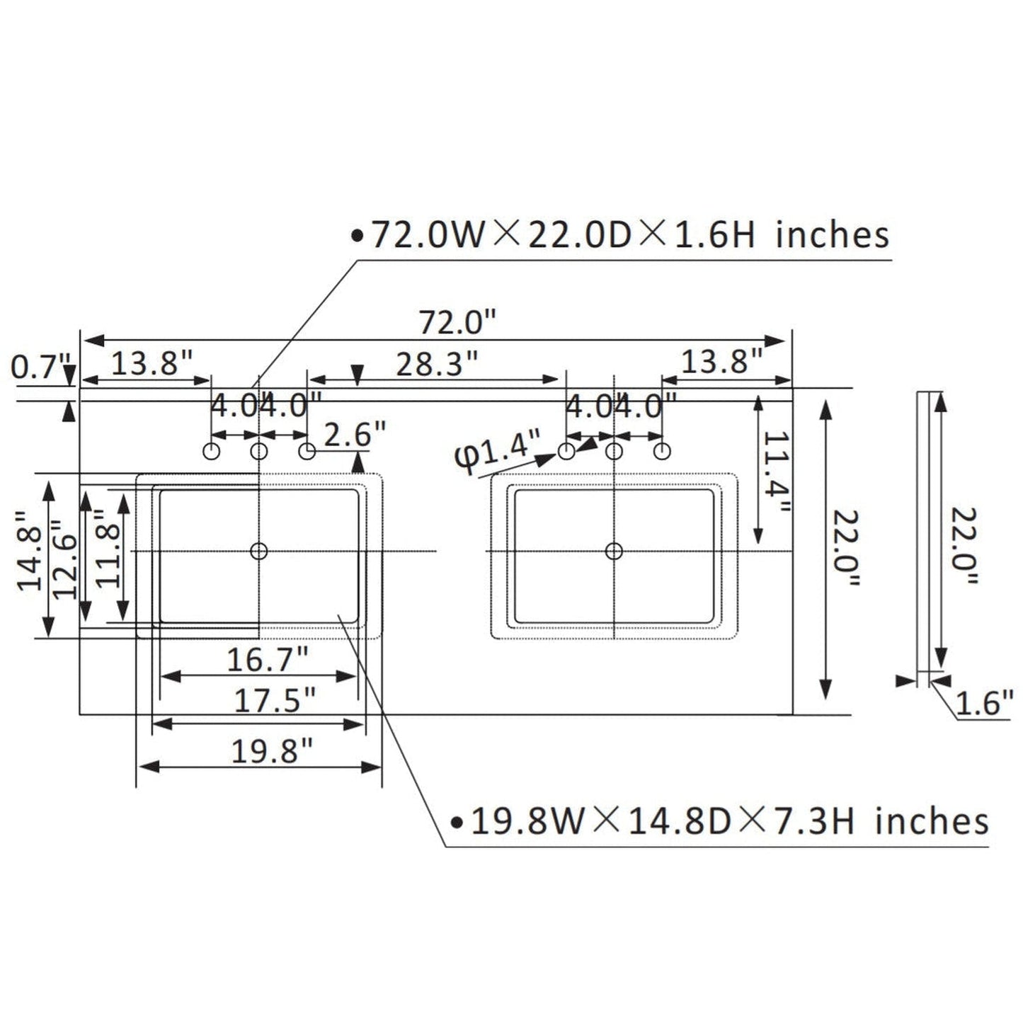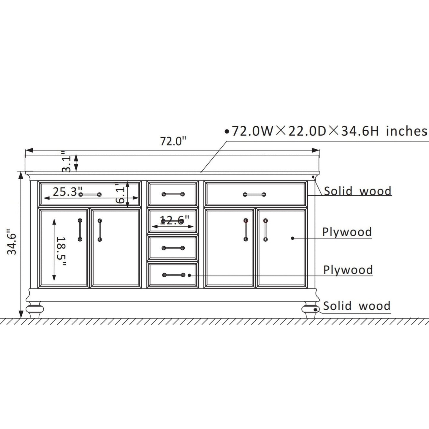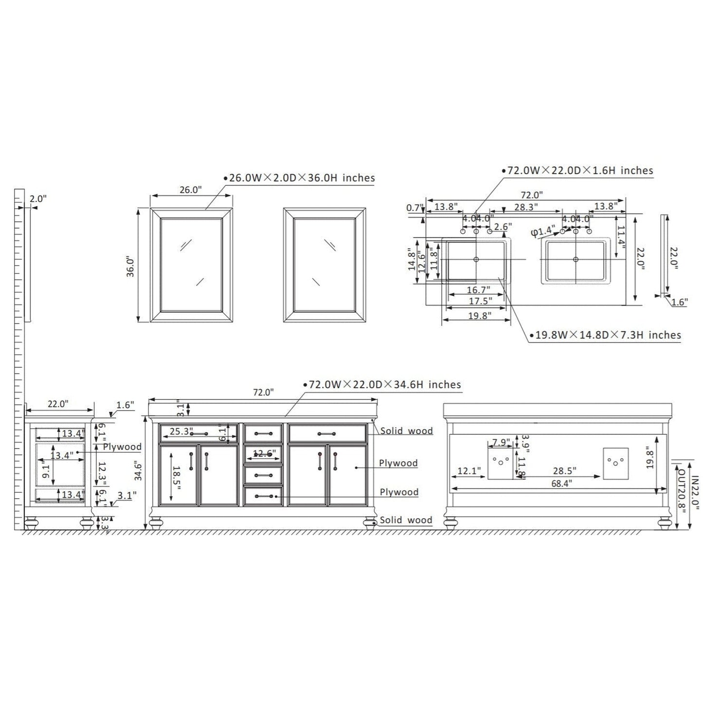 | Vanity Assembled Dimension | 72" W x 22" D x 34.6" H |