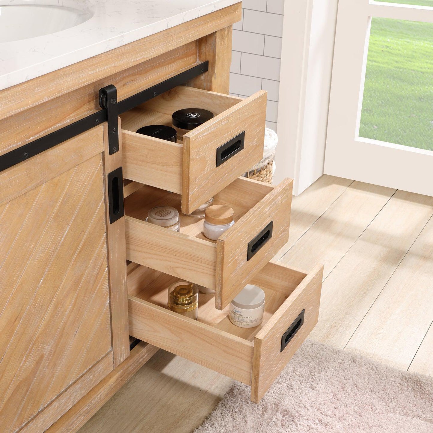 Are you obsessed with the modern farmhouse look? Our Cortes Series vanity adds eye-catching style and loads of storage to any bathroom space. Crafted from solid oak wood, this quality piece blends rustic charm with elegant finishes like a stone-look countertop. Classic black hardware provides a stunning accent for both the cabinet and matching mirror.