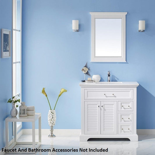 Vinnova Lorna 36" White Freestanding Single Vanity Set In White Carrara Composite Stone Top With Undermount Ceramic Sink and Mirror