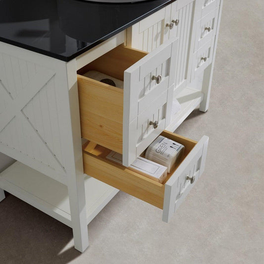 Traditional charm meets contemporary flair with the Modena Vanity Collection. This showstopper ensemble features beadboard trim, a circular vessel sink, and an inky-black glass top that sets off the vanity finish. Concealed and open storage space makes this collection as functional as it is beautiful.
