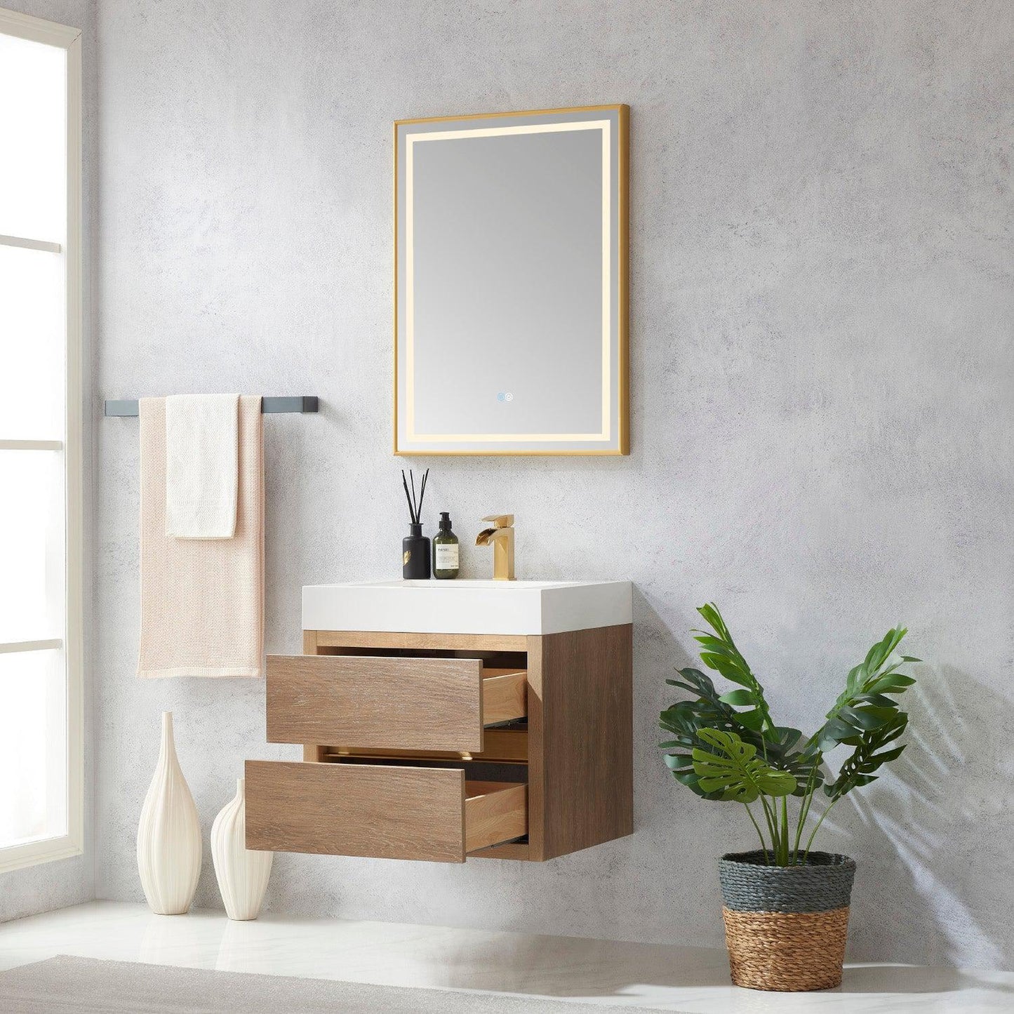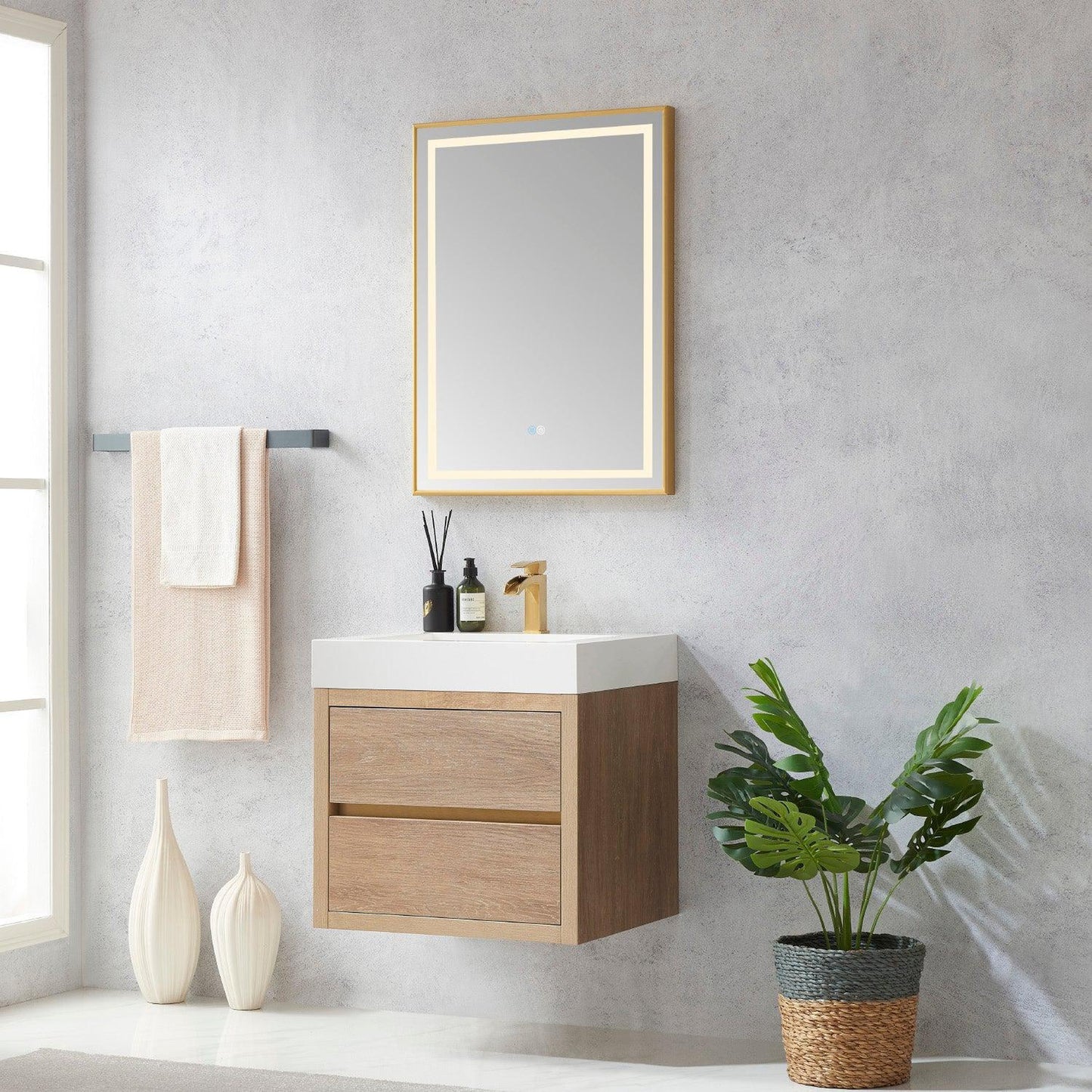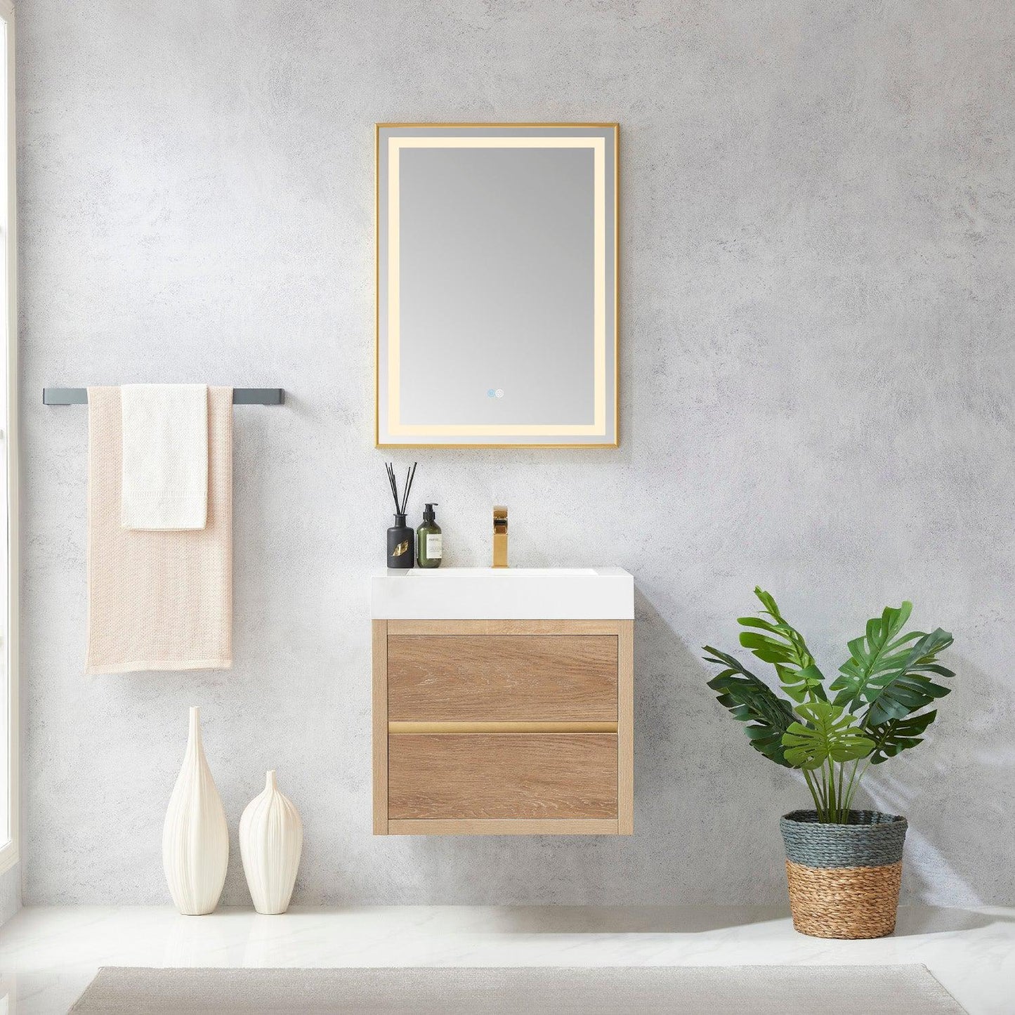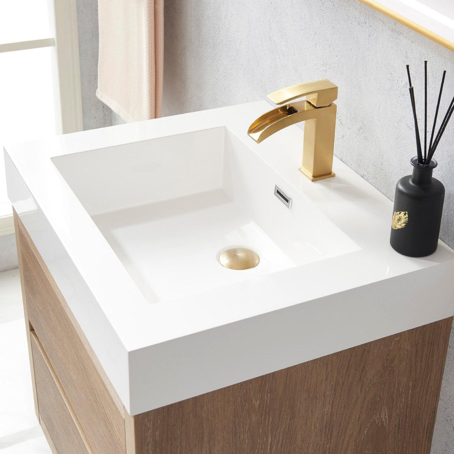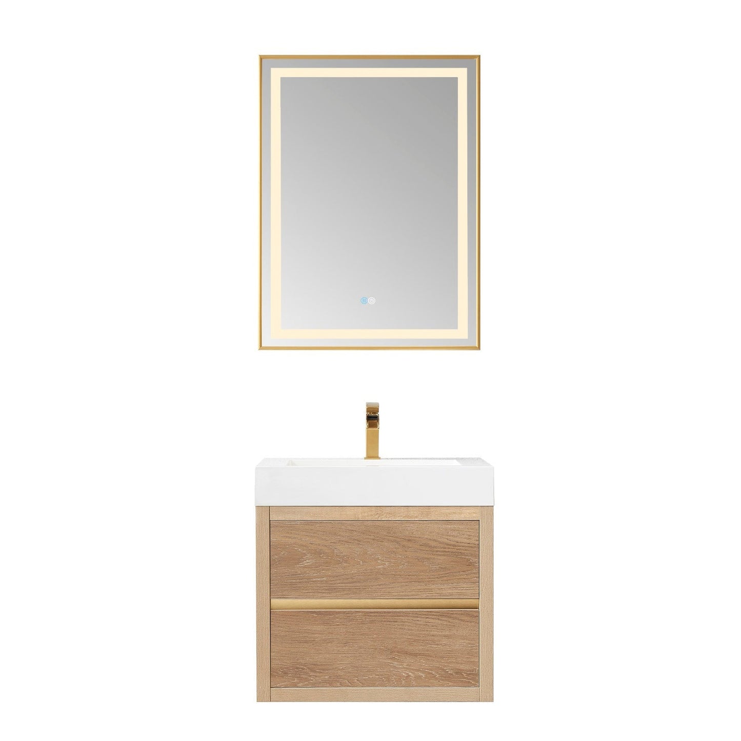 Vinnova Palencia 24" Single Sink Wall-Mount Bath Vanity In North American Oak With White Composite Integral Square Sink Top And Mirror