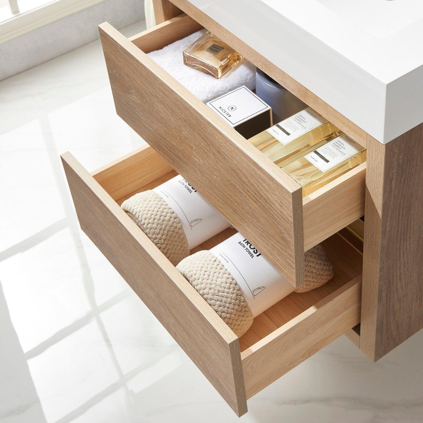 - Double soft-close drawers conceal ample storage for toiletries.