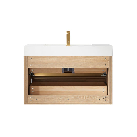 Vinnova Palencia 36" Single Sink Wall-Mount Bath Vanity In North American Oak With White Composite Integral Square Sink Top And Mirror