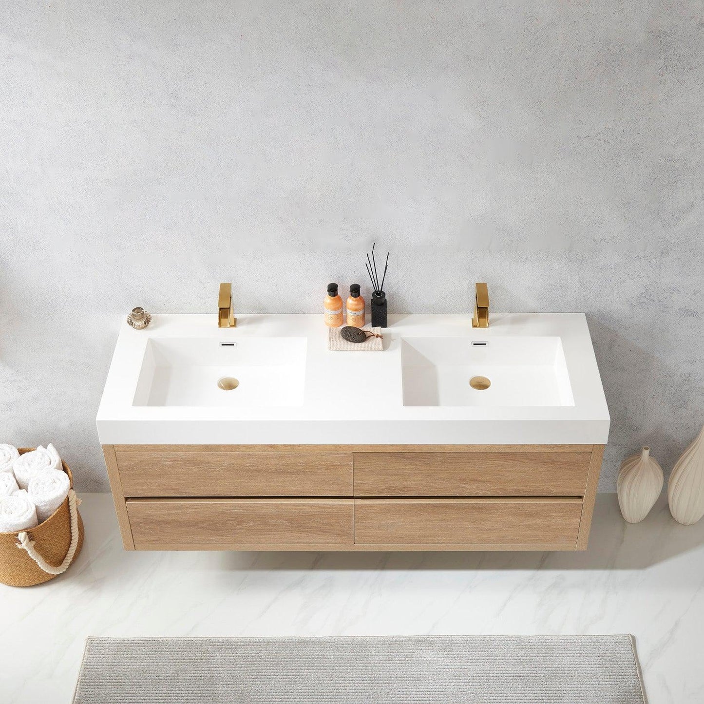 Vinnova Palencia 60" Double Sink Wall-Mount Bath Vanity In North American Oak With White Composite Integral Square Sink Top