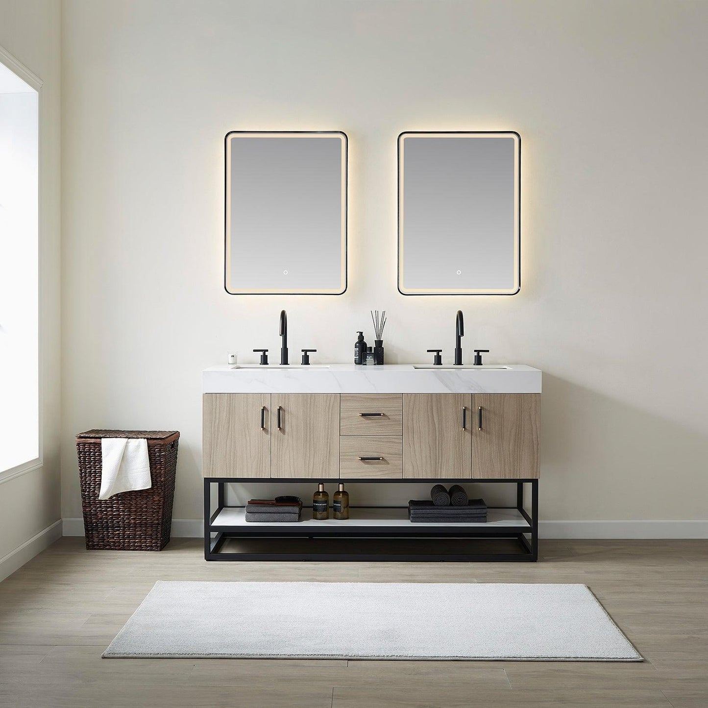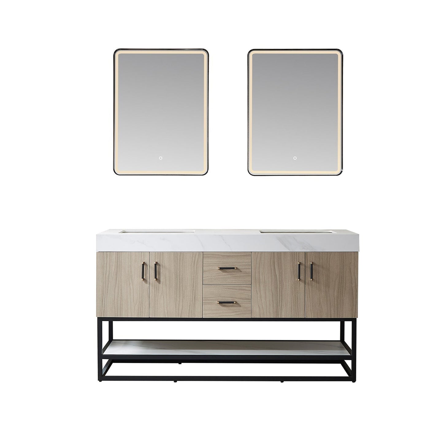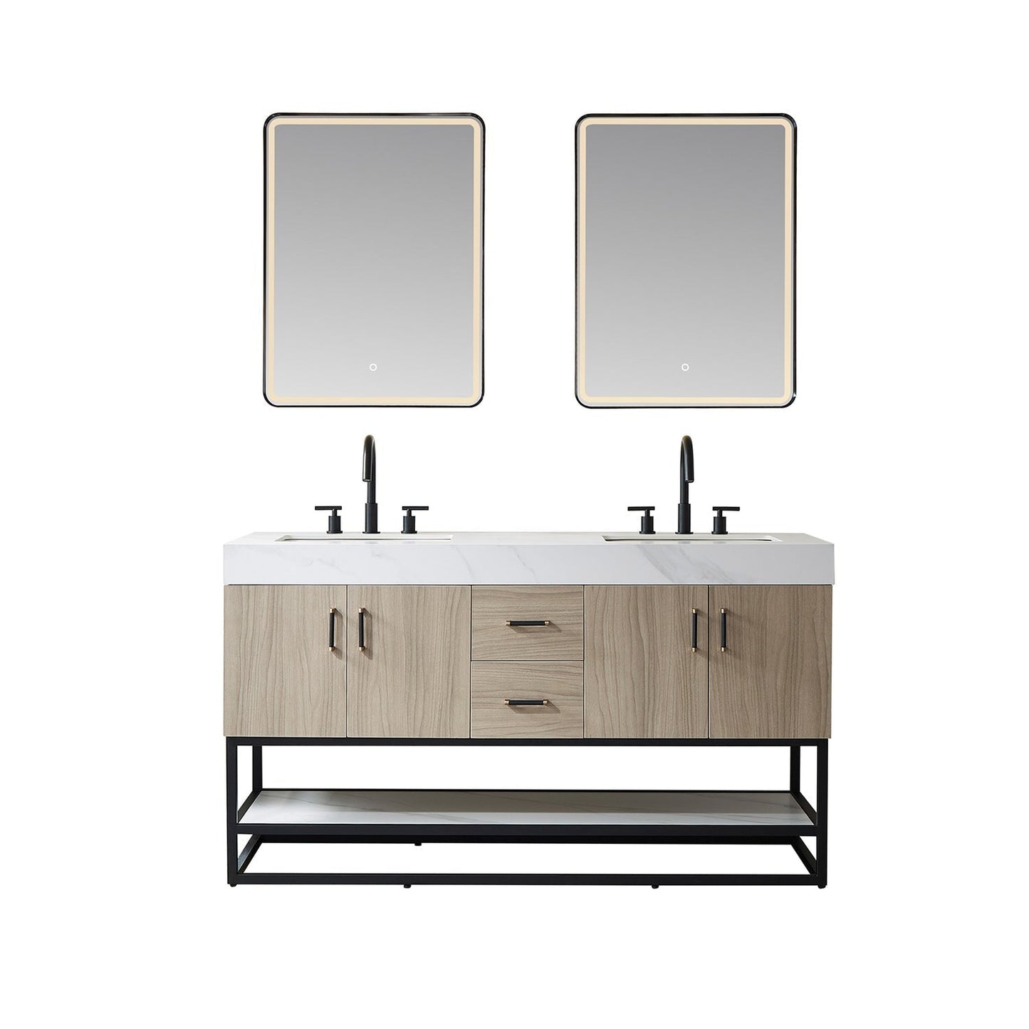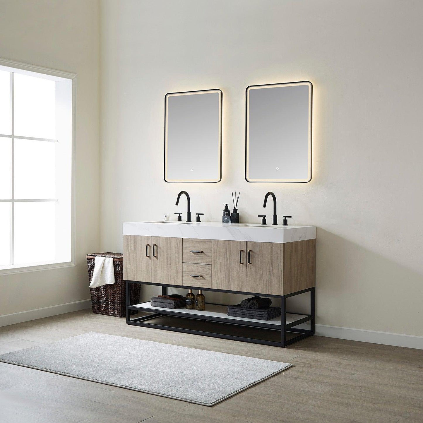 Vinnova Toledo 60" Double Sink Bath Vanity In Light Walnut Finish With White Sintered Stone Top And Mirror