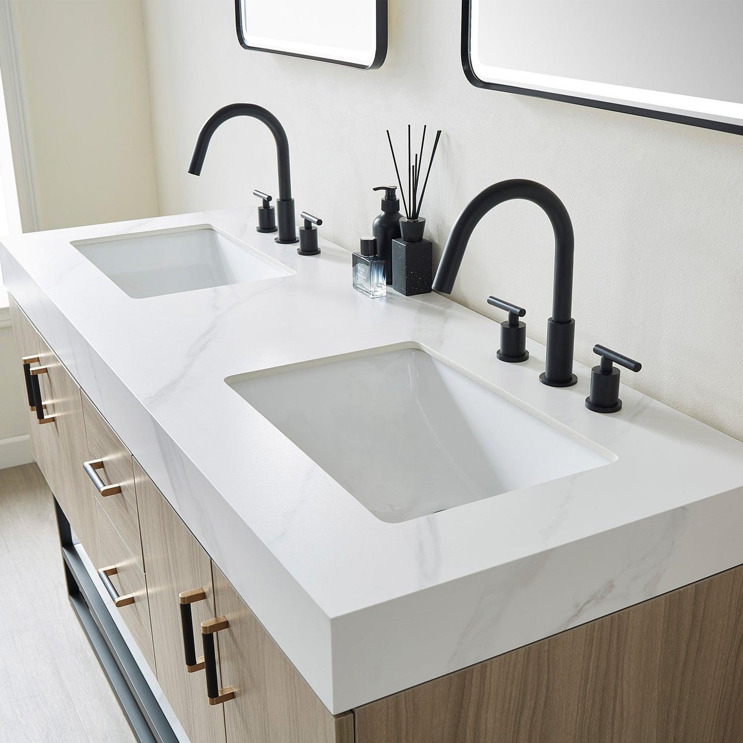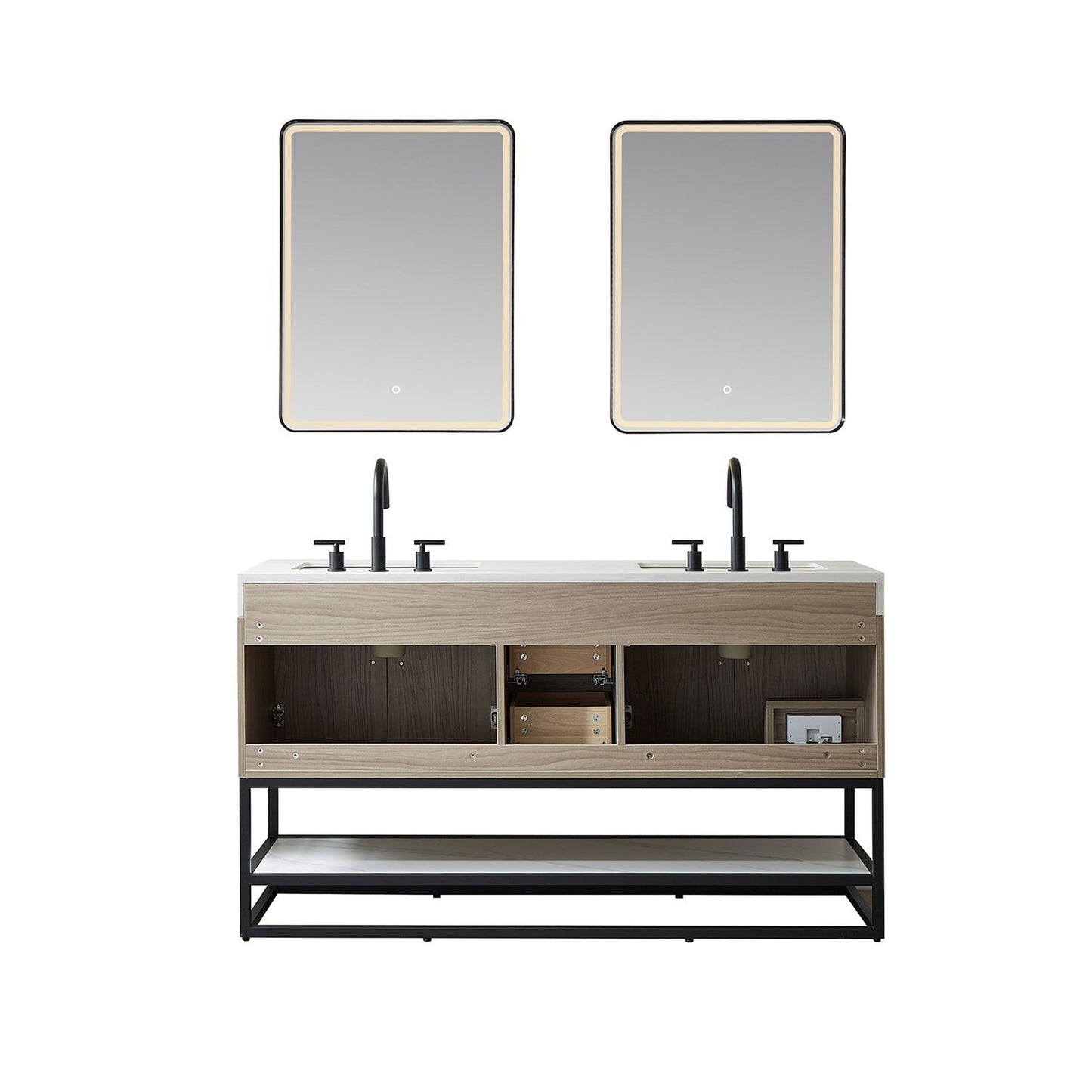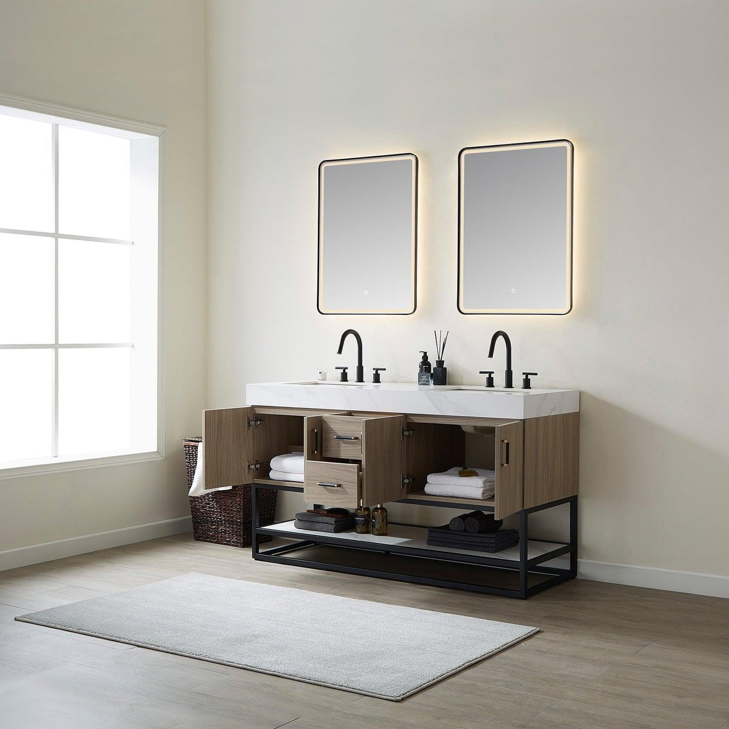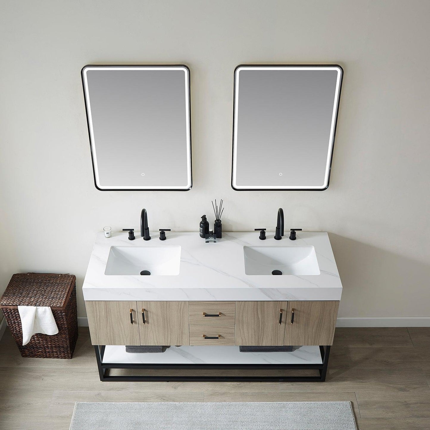 Vinnova Toledo 60" Double Sink Bath Vanity In Light Walnut Finish With White Sintered Stone Top And Mirror