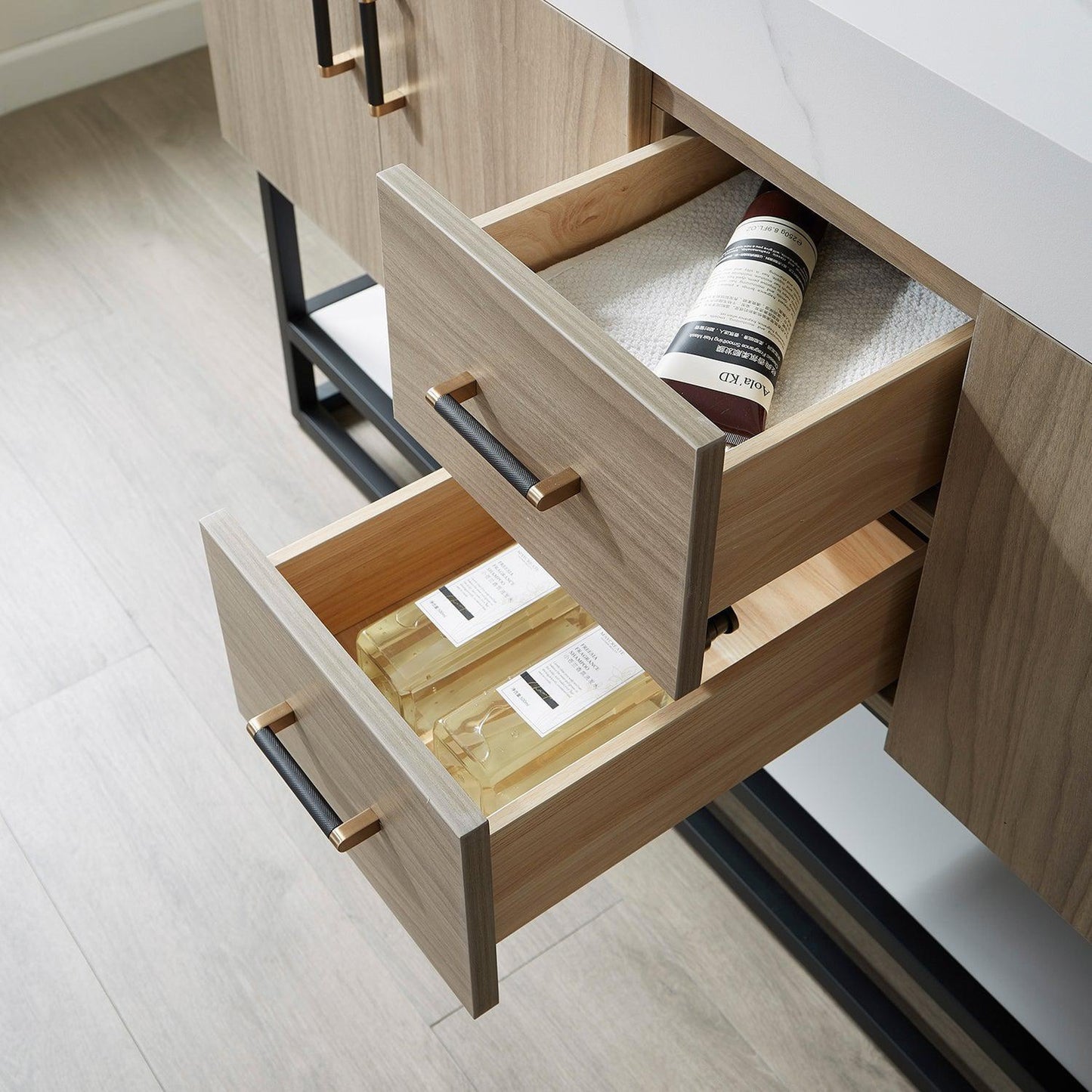 Toledo brings elegance and head-turning style to your modern bathroom space, optioning combination with touch-sensor LED mirror. The cabinets are made of Plywood and Technology moisture-proof board which can protect the beautiful vanity from water damage. Styled with high quality white sintered stone for a contemporary finish. Open shelving down below offers space for towels, toiletries, decorative items, and more. The option of brushed gold or matte black hardware compliments for a perfect opulent finish.