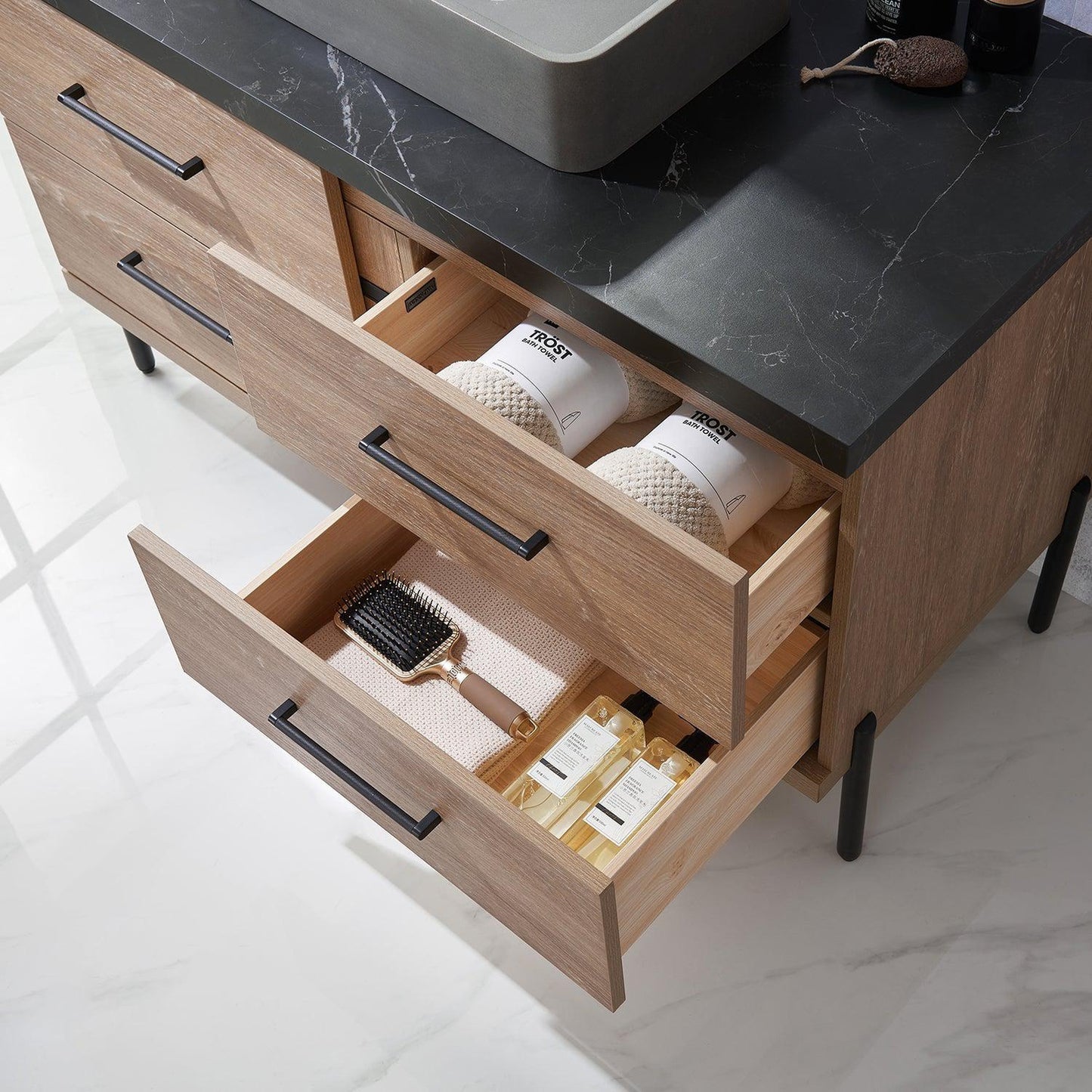 Personalize the look of your vanity with our innovative Trento Series. Featuring an exquisite sintered-stone countertop and concrete vessel sink, this vanity lets you choose the sink style and shape you prefer. You’ll love the blend of concrete, marbled stone, and wood textures, which lend warmth and visual interest to this ensemble. Spacious drawers offer seamless concealed storage for all your guest or master bath toiletries.