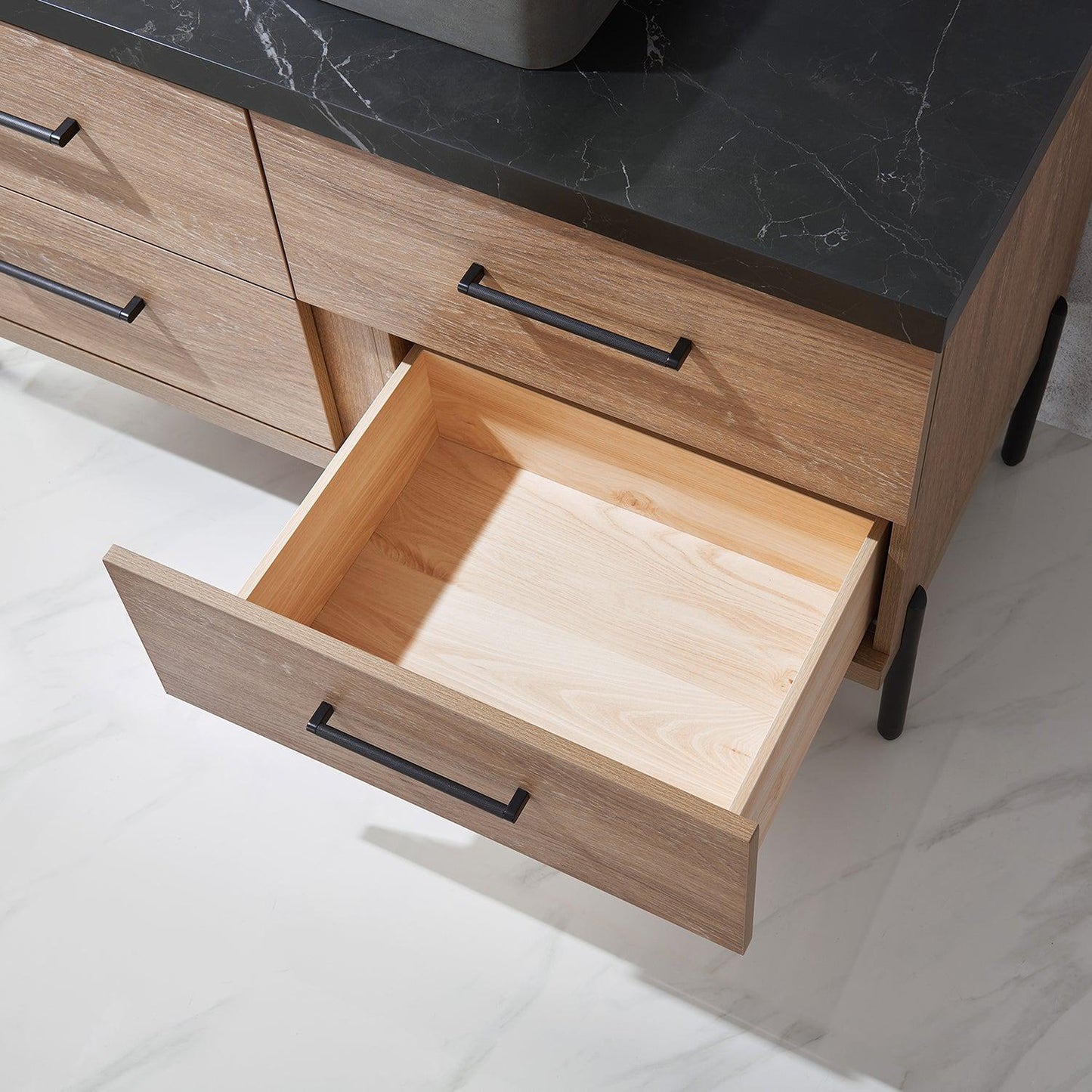 - Soft-closing drawers feature a full-extension glide