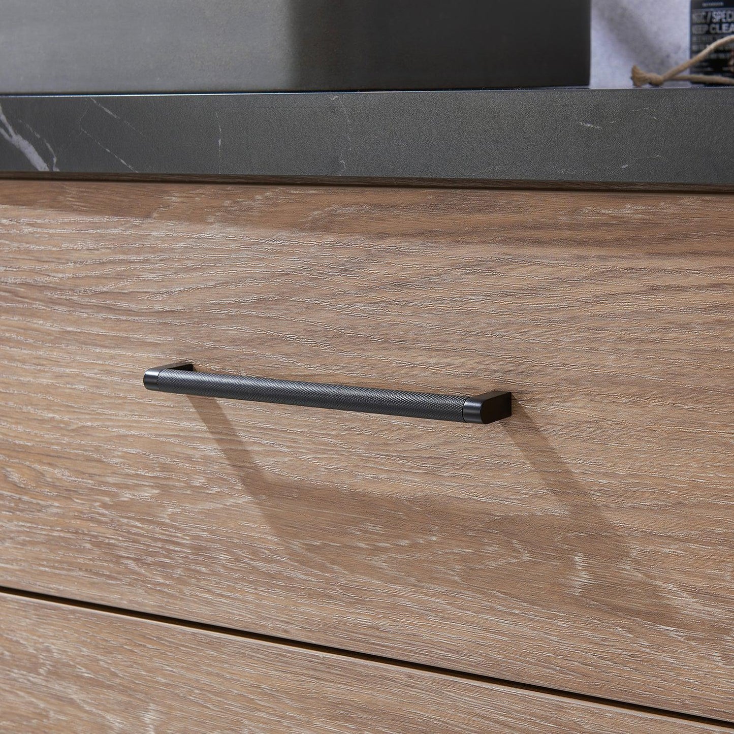 - Matte Black-finish hardware lends a touch of modern style and bold contrast.